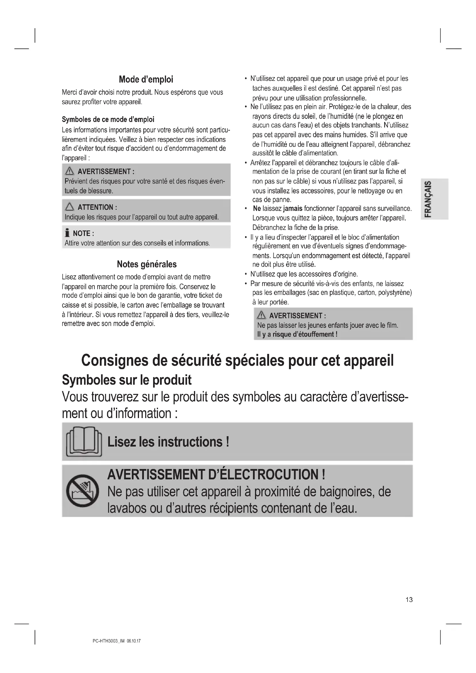 Ne pas laisser les jeunes enfants jouer avec le lm. Il y a risque d’étouffement ! Consignes de sécurité spéciales pour cet appareil Symboles sur le produit Vous trouverez sur le produit des symboles au caractère d’avertisse- ment ou d’information : Lisez les instructions ! AVERTISSEMENT D’ÉLECTROCUTION ! Ne pas utiliser cet appareil à proximité de baignoires, de lavabos ou d’autres récipients contenant de l’eau.PC-HTH3003_IM 06.10.17