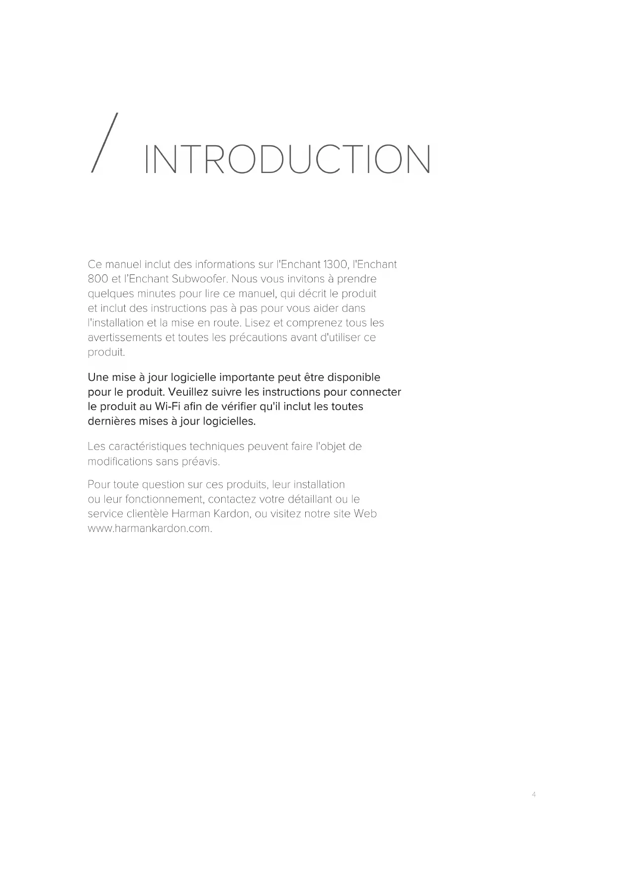 INTRODUCTION Ce manuel inclut des informations sur l'Enchant 1300, l'Enchant 800 et l’Enchant Subwoofer. Nous vous invitons à prendre quelques minutes pour lire ce manuel, qui décrit le produit et inclut des instructions pas à pas pour vous aider dans l'installation et la mise en route. Lisez et comprenez tous les avertissements et toutes les précautions avant d'utiliser ce produit. Une mise à jour logicielle importante peut être disponible pour le produit. Veuillez suivre les instructions pour connecter le produit au Wi-Fi an de vérier qu'il inclut les toutes dernières mises à jour logicielles. Les caractéristiques techniques peuvent faire l'objet de modications sans préavis. Pour toute question sur ces produits, leur installation ou leur fonctionnement, contactez votre détaillant ou le service clientèle Harman Kardon, ou visitez notre site Web www.harmankardon.com.5