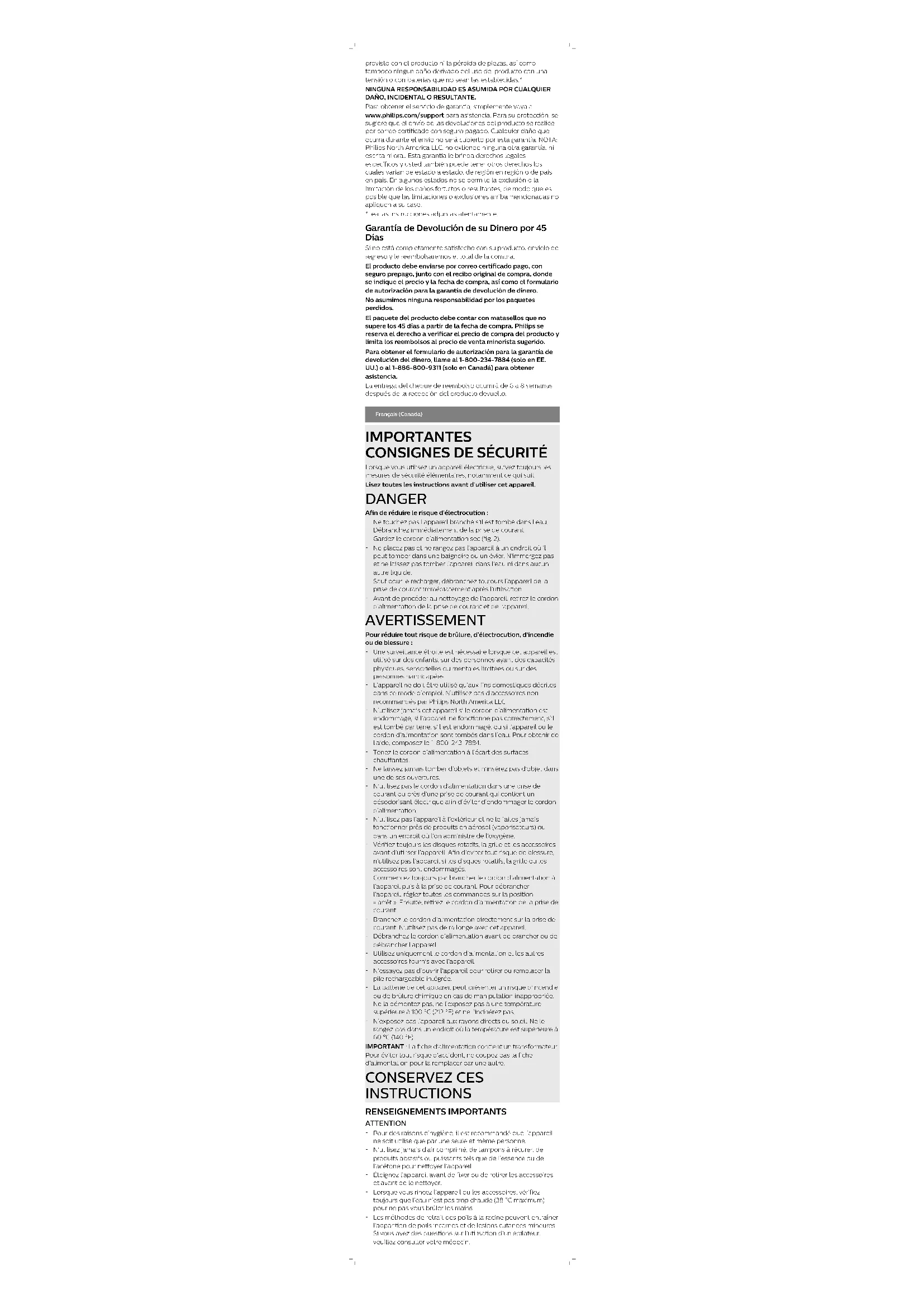 OU INDIRECTS. Pour obtenir un service d’entretien couvert par cette garantie, il suffit de visiter le site www.philips.com/support afin d’obtenir de l’aide. Pour votre protection, nous vous recommandons d’effectuer vos envois de retour par courrier avec assurance prépayée. Tout dommage résultant de l’expédition n’est pas couvert par cette garantie. REMARQUE: Aucune autre garantie, écrite ou orale, n’est autorisée par Philips North America LLC. Cette garantie vous confère des droits légaux précis; il est possible que vous ayez d’autres droits pouvant varier d’un État à l’autre, d’une province à l’autre ou d’un pays à l’autre. Certains États et certaines provinces n’autorisent pas l’exclusion ou la limitation des dommages indirects ou consécutifs; par conséquent, il est possible que certaines limitations ou exclusions présentées ci-dessus ne s’appliquent pas à votre cas. *Veuillez lire attentivement les instructions fournies. Garantie de Remboursement de 45 Jours Si vous n’êtes pas entièrement satisfait de l’appareil, retournez-le et nous vous rembourserons le prix d’achat complet. Le produit doit être expédié port payé par poste assurée avec assurance prépayée, et l’envoi doit comprendre le reçu original indiquant le prix et la date de l’achat, ainsi que le formulaire d’autorisation de retour en vertu de la garantie de remboursement. Nous n’assumons aucune responsabilité en cas de perte par la poste. L’envoi de l’appareil doit être fait au plus tard 45 jours suivant la date d’achat, le cachet de la poste en faisant foi. Philips se réserve le droit de vérifier le prix d’achat de l’appareil et de limiter le montant du remboursement au prix de détail suggéré. Pour obtenir le formulaire d’autorisation de retour de la garantie de remboursement, composez le 1 800 234-7884 (aux États-Unis uniquement) ou le 1 886 800-9311 (au Canada uniquement) pour obtenir de l’aide. Le chèque de remboursement sera envoyé 6à 8semaines après réception du produit retourné.