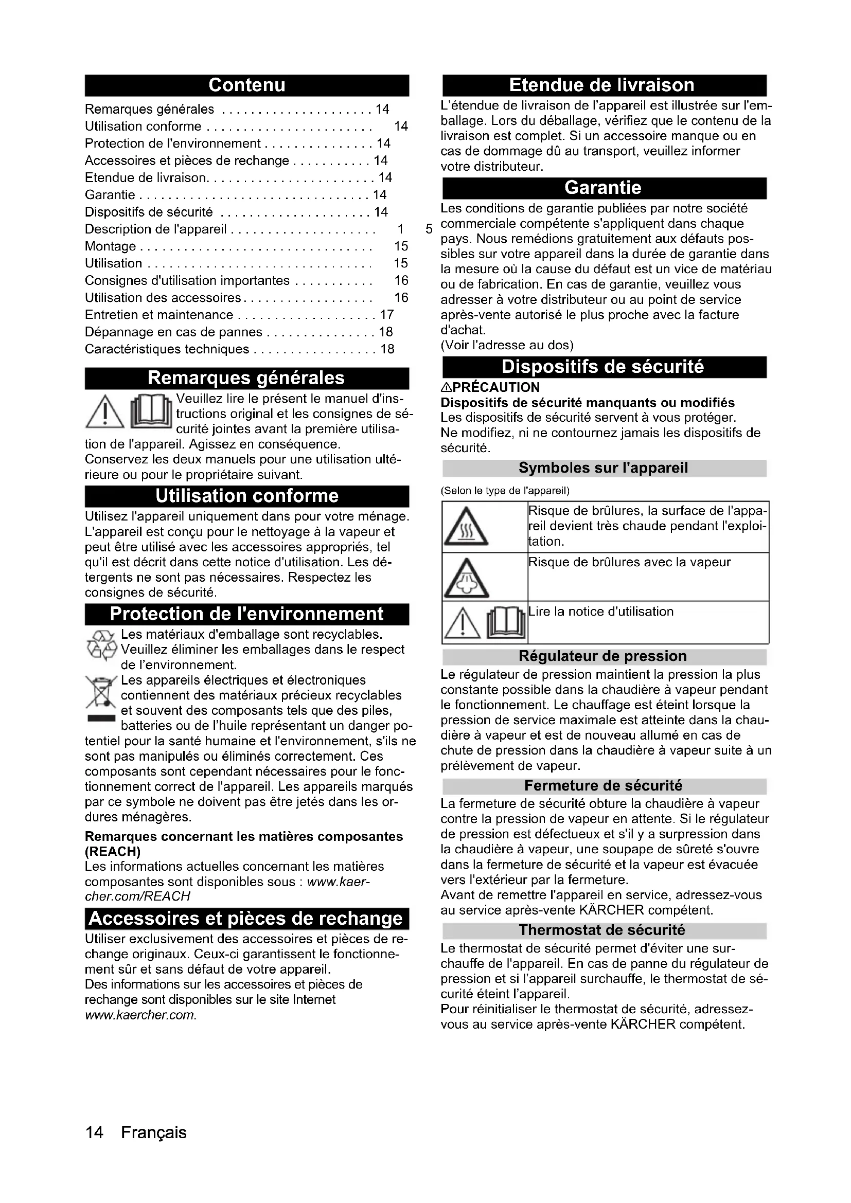 - temperature of 60 °C in the washing machine. Troubleshooting guide Malfunctions often have simple causes that you can remedy yourself using the following overview. When in doubt, or in the case of malfunctions not mentioned here, please contact your authorised Customer Service. 몇 WARNING Risk of electric shock and burns Trying to eliminate faults while the appliance is connect- ed to the mains or has not yet cooled down is always dangerous. Remove the mains plug. Allow the appliance to cool down. The steam boiler is scaled. Descale the steam boiler No steam No water in the steam boiler Refill water, see Chapter Refilling water. The steam lever cannot be pressed The steam lever is locked with the child lock. Set the child lock (selector switch for steam volume) to the front. The steam lever is released. Long heating-up time The steam boiler is scaled. Descale the steam boiler. High water egress The steam boiler is too full. Press the steam gun until a little water comes out. High water output The steam boiler is scaled. Descale the steam boiler. Technical data Subject to technical modifications. Hardness range °dH mmol/l KF I soft 0-7 0-1.3 55 II Medium 7-14 1.3-2.5 45 III Hard 14-21 2.5-3.8 35 IV Very hard >21 >3.8 25 Electrical connection Voltage V 220-240 Phase ~ 1 Frequency Hz 50-60 Protection class IPX4 Protection category I Performance data Heating capacity W 1500 Maximum operating pressure MPa 0.32 Heating-up time Minutes 6.5 Continuous steaming g/min 40 Maximum steam blast g/min 100 Filling quantity Steam boiler l 1.0 Dimensions and weights Weight (without accessories) kg 3.1 Length mm 380 Width mm 254 Height mm 26014 Français Contenu Remarques générales Veuillez lire le présent le manuel d'ins- tructions original et les consignes de sé- curité jointes avant la première utilisa- tion de l'appareil. Agissez en conséquence. Conservez les deux manuels pour une utilisation ulté- rieure ou pour le propriétaire suivant. Utilisation conforme Utilisez l'appareil uniquement dans pour votre ménage. L'appareil est conçu pour le nettoyage à la vapeur et peut être utilisé avec les accessoires appropriés, tel qu'il est décrit dans cette notice d'utilisation. Les dé- tergents ne sont pas nécessaires. Respectez les consignes de sécurité. Protection de l'environnement Les matériaux d'emballage sont recyclables. Veuillez éliminer les emballages dans le respect de l’environnement. Les appareils électriques et électroniques contiennent des matériaux précieux recyclables et souvent des composants tels que des piles, batteries ou de l’huile représentant un danger po- tentiel pour la santé humaine et l'environnement, s'ils ne sont pas manipulés ou éliminés correctement. Ces composants sont cependant nécessaires pour le fonc- tionnement correct de l'appareil. Les appareils marqués par ce symbole ne doivent pas être jetés dans les or- dures ménagères. Remarques concernant les matières composantes (REACH) Les informations actuelles concernant les matières composantes sont disponibles sous : www.kaer- cher.com/REACH Accessoires et pièces de rechange Utiliser exclusivement des accessoires et pièces de re- change originaux. Ceux-ci garantissent le fonctionne- ment sûr et sans défaut de votre appareil. Des informations sur les accessoires et pièces de rechange sont disponibles sur le site Internet www.kaercher.com. Etendue de livraison L’étendue de livraison de l’appareil est illustrée sur l'em- ballage. Lors du déballage, vérifiez que le contenu de la livraison est complet. Si un accessoire manque ou en cas de dommage dû au transport, veuillez informer votre distributeur. Garantie Les conditions de garantie publiées par notre société commerciale compétente s'appliquent dans chaque pays. Nous remédions gratuitement aux défauts pos- sibles sur votre appareil dans la durée de garantie dans la mesure où la cause du défaut est un vice de matériau ou de fabrication. En cas de garantie, veuillez vous adresser à votre distributeur ou au point de service après-vente autorisé le plus proche avec la facture d'achat. (Voir l'adresse au dos) Dispositifs de sécurité 몇 PRÉCAUTION Dispositifs de sécurité manquants ou modifiés Les dispositifs de sécurité servent à vous protéger. Ne modifiez, ni ne contournez jamais les dispositifs de sécurité. Symboles sur l'appareil (Selon le type de l'appareil) Régulateur de pression Le régulateur de pression maintient la pression la plus constante possible dans la chaudière à vapeur pendant le fonctionnement. Le chauffage est éteint lorsque la pression de service maximale est atteinte dans la chau- dière à vapeur et est de nouveau allumé en cas de chute de pression dans la chaudière à vapeur suite à un prélèvement de vapeur. Fermeture de sécurité La fermeture de sécurité obture la chaudière à vapeur contre la pression de vapeur en attente. Si le régulateur de pression est défectueux et s'il y a surpression dans la chaudière à vapeur, une soupape de sûreté s'ouvre dans la fermeture de sécurité et la vapeur est évacuée vers l'extérieur par la fermeture. Avant de remettre l'appareil en service, adressez-vous au service après-vente KÄRCHER compétent. Thermostat de sécurité Le thermostat de sécurité permet d'éviter une sur- chauffe de l'appareil. En cas de panne du régulateur de pression et si l’appareil surchauffe, le thermostat de sé- curité éteint l’appareil. Pour réinitialiser le thermostat de sécurité, adressez- vous au service après-vente KÄRCHER compétent. Remarques générales p. 14