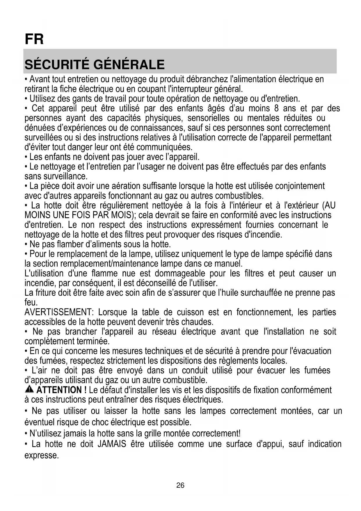 - La hotte ne doit JAMAIS être utilisée comme une surface d'appui, sauf indication expresse.27
