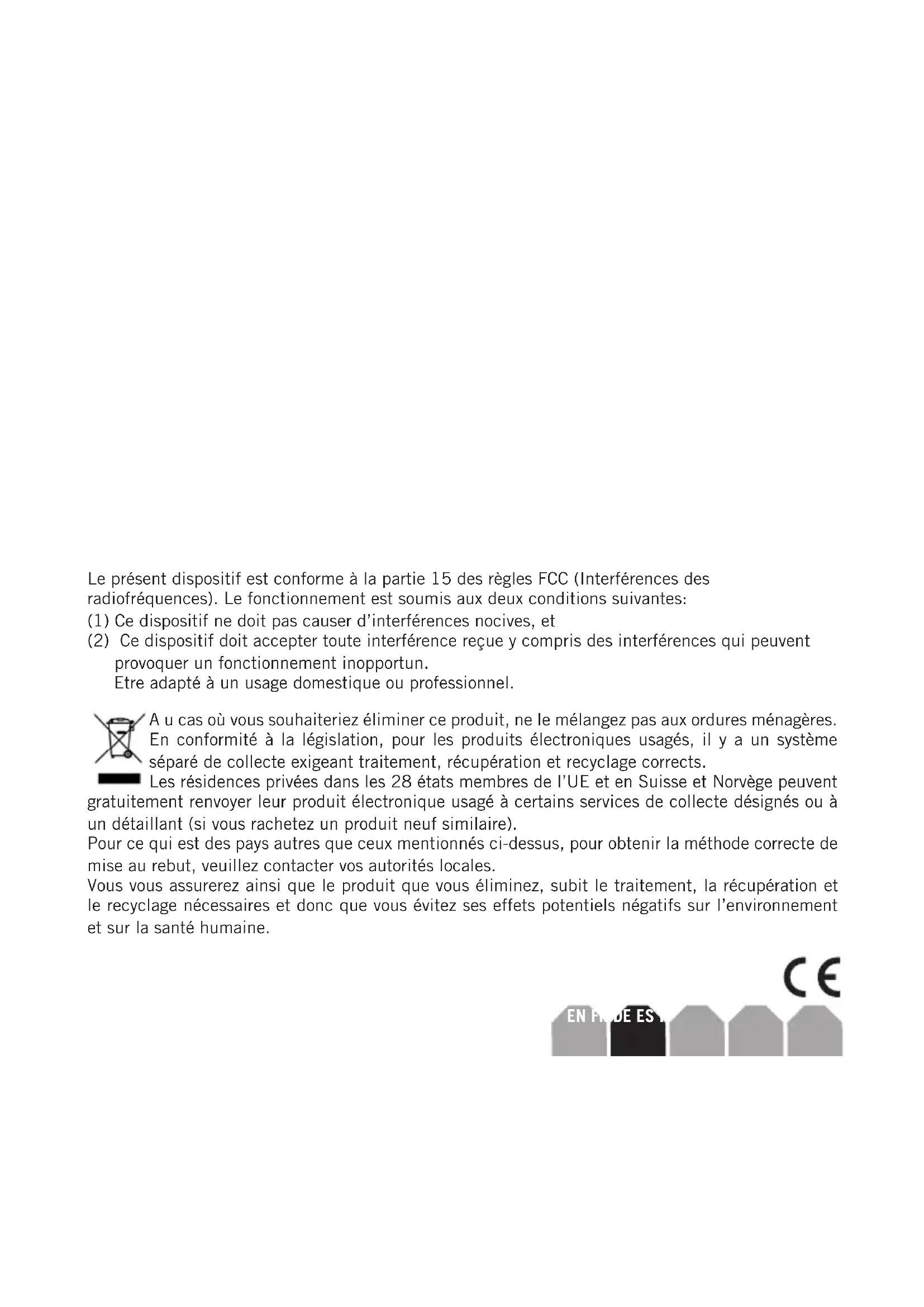 Le present dispositif est conforme à la partie 15 des règles FCC (Interférences des radiofréquences). Le fonctionnement est soumis aux deux conditions suivantes: