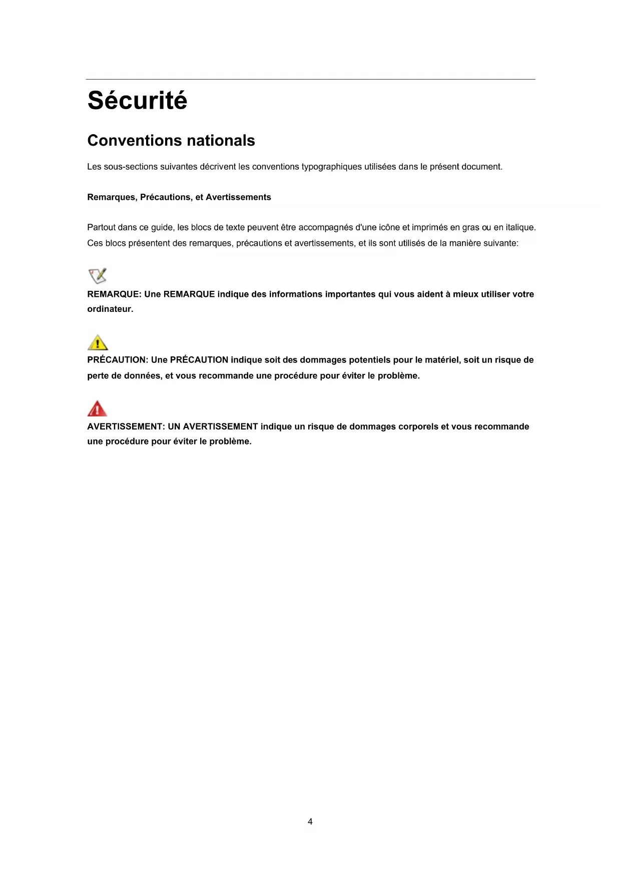 EPEAT Declaration .......................................................................................................................................... 57Sécurité Conventions nationals Les sous-sections suivantes décrivent les conventions typographiques utilisées dans le présent document. Remarques, Précautions, et Avertissements Partout dans ce guide, les blocs de texte peuvent être accompagnés d'une icône et imprimés en gras ou en italique. Ces blocs présentent des remarques, précautions et avertissements, et ils sont utilisés de la manière suivante: