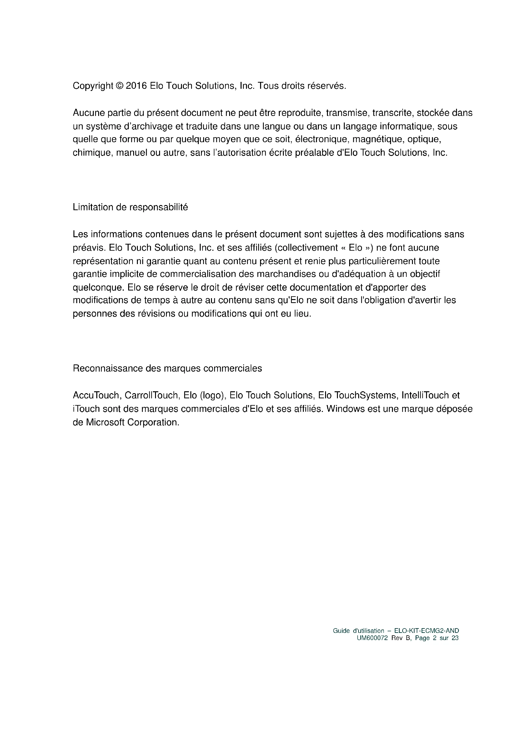 Aucune partie duprésent document ne peut être reproductive, transmise, transcrité, stockée dans un système d'archivage et traduite dans une langue ou dans un langage informatique, sous qu'elle que forme ou parquelque moyen que ce soit, électronique, magnétique, optique, chimique, manuel ou autre, sans l'autorisation écrite préalable d'Elo Touch Solutions, Inc.