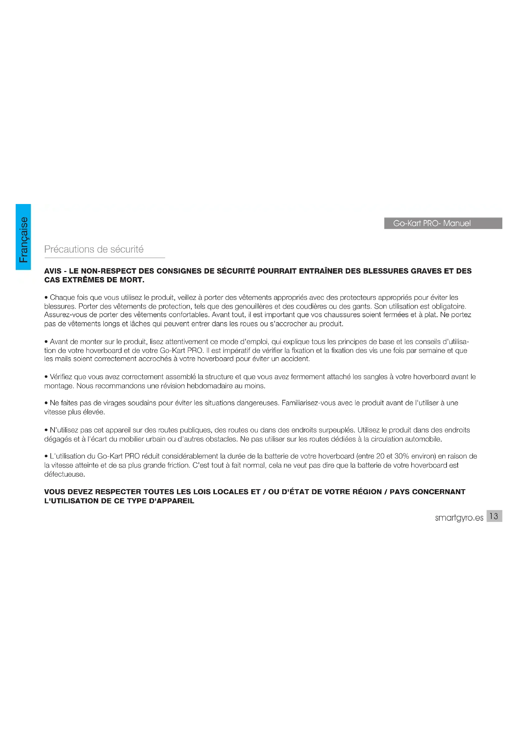 Go-Kart PRO- Manuel Important L'utilisation du Go-Kart PRO réduit considérablement la durée de la batterie de votre hoverboard (environ 20-30%) par la vitesse atteinte et sa plus grande friction. C'est tout à fait normal, cela ne veut pas dire que la batterie de votre hoverboard est défectueuse. Si vous avez utilisé le skate avec Go-kart PRO ou tout autre support similaire, la durée de vie de la batterie est plus courte car elle soumet le skate à une vitesse beaucoup plus élevée et de façon conti- nue. Gardez à l'esprit qu'en utilisant ce type de supports, le patin surchauffe, il est donc nécessaire d'attendre que la température baisse pour le recharger. Recycler votre appareil Les produits électriques ou électroniques, piles, accumulateurs et autres accessoires doivent obligatoirement être collectés séparément. Lorsque vous avez terminé la vie utile de votre appareil électrique ou électronique, retirez les piles et déposez-les, séparément, dans le bon récipient pour une gestion correcte. Gardez à l'esprit que les piles ne peuvent pas être déposées sans discernement avec les ordures ménagères. Envisager le recyclage selon les directi- ves du fabricant. Avec ce geste, il aidera à réduire les risques pour votre santé et à préserver l'environnement. Si vous avez des questions, consultez votre municipalité ou votre distributeur pour obtenir les détails essentiels concer- nant le recyclage de votre ancien appareil. No. REI-RPA 1201-RD.106 / 2008. Observations - Vous devez toujours porter un casque et des protections pour éviter les blessures corporelles en cas de chute. - Il est conçu pour être utilisé par toute personne à partir de 14 ans avec la surveillance d'un adulte. - SmartGyro n'est pas responsable de la mauvaise utilisation que l'utilisateur fait de ce produit. Il est important que vous suiviez strictement les mesures de sécurité de ce manuel. - L'unité comprend des protections en feutre spéciales à placer sur la partie métallique du Go-Kart afin de ne pas rayer ou marquer le Hoverboard.smartgyro.es Precauzioni di sicurezza AVVISO - IL MANCATO RISPETTO DELLE ISTRUZIONI PER LA SICUREZZA POTREBBE RISULTARE GRAVI LESIONI CORPOREE E IN CASI ESTREMI DI MORTE.