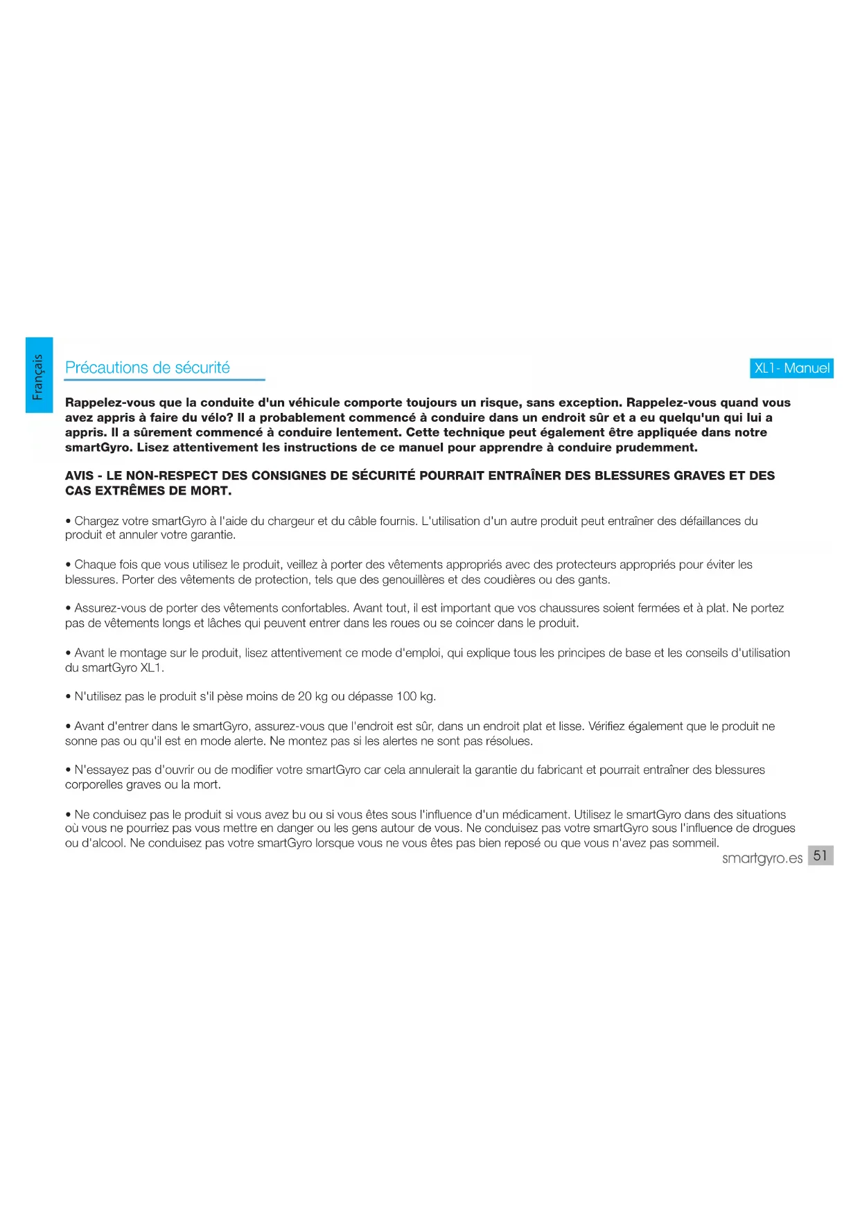 Exigence de sécurité technique L'adaptateur d'alimentation est le périphérique de déconnexion de l'appareil. La prise de courant doit être proche de l'équipement et facilement accessible. Recycler votre appareil Les produits électriques ou électroniques, piles, accumulateurs et autres accessoires doivent obligatoirement être collectés séparément. Lorsque vous avez terminé la vie utile de votre appareil électrique ou électronique, retirez les piles et dépo- sez-les, séparément, dans le bon récipient pour une gestion correcte. Gardez à l'esprit que les piles ne peuvent pas être déposées sans discernement avec les ordures ménagères. Envisager le recyclage selon les directives du fabricant. Avec ce geste, il aidera à réduire les risques pour votre santé et à préserver l'environnement. Si vous avez des questions, consultez votre municipalité ou votre distributeur pour obtenir les détails essentiels concernant le recyclage de votre ancien appa- reil.Nº REI- RPA 1201-RD.106/2008. Important - Vous devez toujours porter un casque et des protections pour éviter les blessures corporelles en cas de chute. - Le produit est spécialement conçu pour les intérieurs. - Il est conçu pour être utilisé par toute personne à partir de 10 ans avec la surveillance d'un adulte. Manuel - XL1smartgyro.es Questions fréquentes Est-il légal d'utiliser smartGyro sur une route ou un chemin? Le smartGyro est un produit conçu spécialement pour les intérieurs. Nous ne recommandons donc pas son utilisation sur les routes, les sentiers, à proximité d'une voie publique, d'une piste cyclable, etc. En ce qui concerne sa légalité, la mobilité est régie par les ordonnances municipales, les règles changent donc d'un endroit à l'autre . Il est impératif que vous contactiez les autorités de transport locales et d'état pour plus d'informations. L'icône de la batterie smartGyro est allumée. Que dois-je faire? Veuillez vérifier que l'appareil a été chargé conformément aux instructions. Le smartGyro sonne. Que dois-je faire? Voir page 62 pour une idée précise de ce que les bips peuvent signifier. Je ne peux pas contrôler le smartGyro, que dois-je faire? Consultez les instructions du Guide de l'utilisateur ou consultez les tutoriels en ligne sur smartgyro.es et si vous ne pouvez toujours pas le maîtriser, appelez-nous, nous nous ferons un plaisir de vous aider. Le smartGyro XL1 peut-il avoir un pneu crevé? Oui, les roues peuvent être perforées car ce sont des roues pneumatiques. Prenez les mêmes précautions que vous auriez avec un vélo.