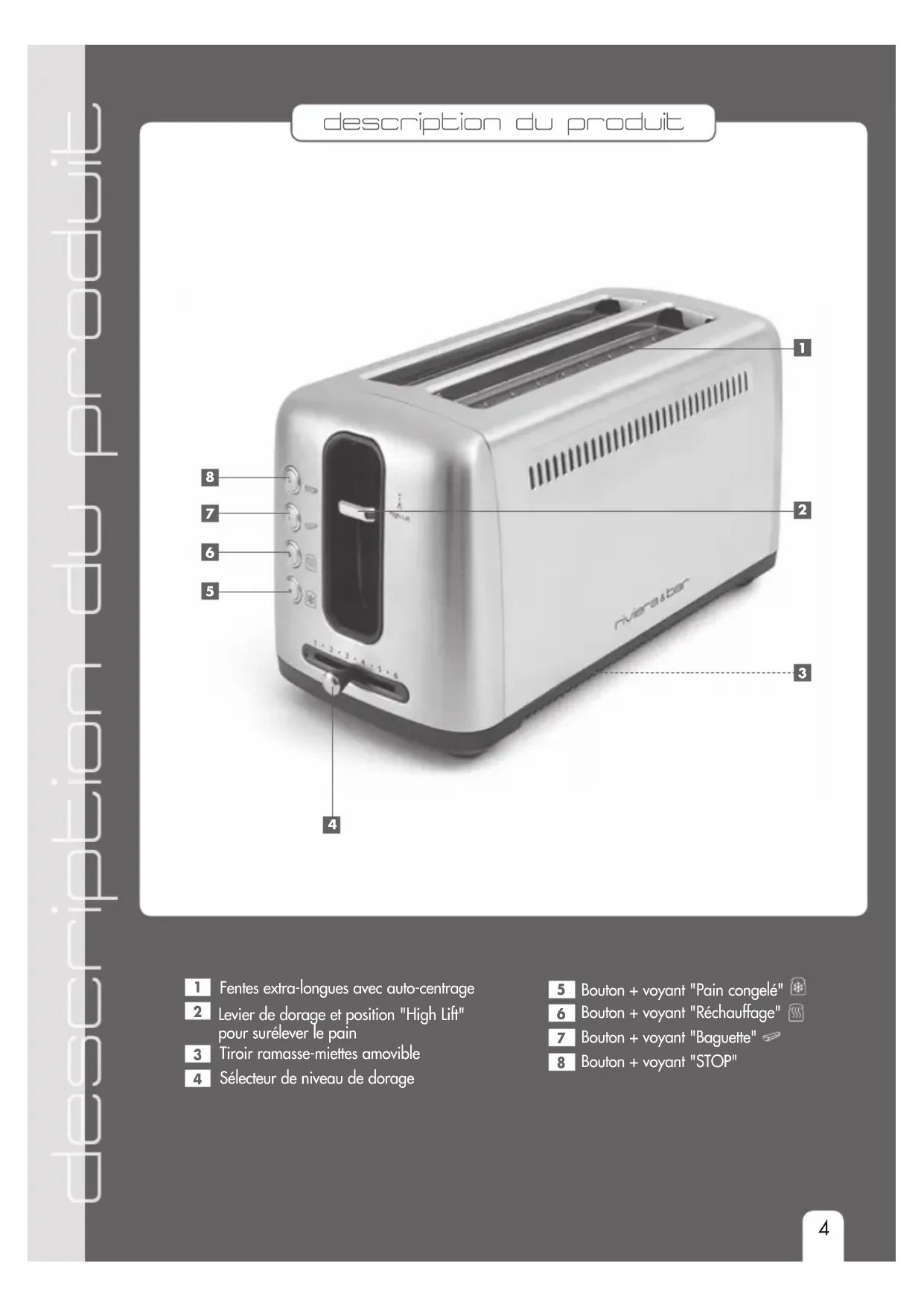 coulisser le sélecteur de dorage (4) sur la position désirée (6 choix possibles). - Sortez les tranches de pain en prenant grand soin de ne pas vous brûler sous l’effet de la température élevée des aliments, de l’intérieur des fentes et de la partie supérieure de l’appareil.- Votre grille-pain est équipé d’une position "High Lift" qui permet d’extraire plus facilement les aliments, notamment ceux de taille réduite. Pour cela, il vous suffit de monter le levier de dorage (2) jusqu’en butée haute et de le maintenir en position le temps de sortir les tranches de pain. Remarques importantes