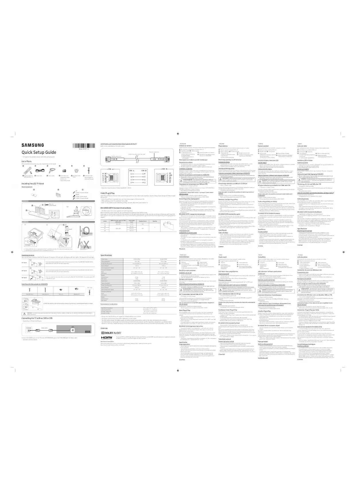 AVERTISSEMENT Connexion du téléviseur avec un décodeur SBB ou STB − Varie selon le modèle et la région. Connectez la prise [DATA] du téléviseur à la prise [ETH MODEM] du décodeur STB (SBB) avec le câble de données. − Utilisation de la communication de données.Liste des fournisseurs et des câbles de données compatibles fournis avec le téléviseurReportez-vous à l'étiquette de code des câbles de données. − Information sur le fonctionnement du câble de données (RJ12): RS-232 Installation Plug & Play pour hôtel La fonction Hotel Plug & Play effectue automatiquement et une seule fois la sélection du mode Hotel, la configuration du pays, le réglage de l'horloge et le paramétrage du mode Image. − Le Plug & Play pour hôtel n’est disponible qu’une seule fois, lorsque l’appareil est mis sous tension (ON) pour la première fois. − Après la configuration du téléviseur en premier lieu et l'exécution de la fonction Clone TV to USB [Cloner TV vers USB] − Ensuite, le téléviseur doit simplement sortir de la fonction Hotel Plug & Play, établir une connexion USB, puis exécuter la fonction Clone USB to TV [Cloner USB vers TV]. Instructions standards EN 60065:2014 − Le kit de montage mural n'est pas fourni; il est vendu séparément.Lors de l'installation d'un kit de montage mural, nous vous recommandons de fixer les quatre vis VESA.Si vous souhaitez installer un kit de montage mural qui se fixe au mur au moyen de deux vis supérieures uniquement, veillez à utiliser un kit de montage mural Samsung compatible avec ce type d'installation. (Il se peut que ce type de kit de montage mural ne soit pas disponible à l'achat dans certaines régions.) − Nom du modèle / Spécifications VESA pour trou de vis (A * B) en millimètres / Profondeur de vis (mm) / Vis standard / Quantité Caractéristiques techniques Conditions ambiantes − La conception et les spécifications peuvent être modifiées sans préavis. − Les spécifications ci-dessus peuvent varier en fonction du modèle. − Pour plus d'informations sur les caractéristiques d'alimentation et de consommation électrique, reportez-vous à l'étiquette fixée au produit. − Pour en savoir plus sur les engagements de Samsung en matière d'environnement et les obligations réglementaires spécifiques à un produit (REACH, DEEE, piles, etc.), rendez-vous sur http://www.samsung.com/uk/aboutsamsung/samsungelectronics/corporatecitizenship/data_corner.html Licences Quick Setup Guide − To register this product please visit www.samsung.com List of Parts The provided accessories may vary depending on the model.