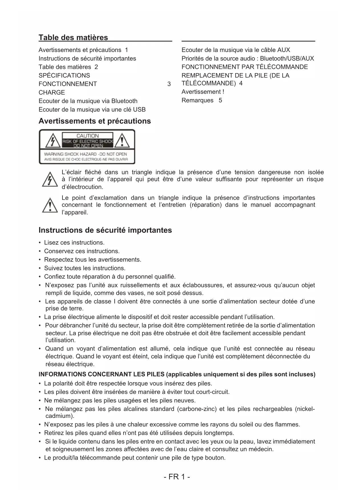AVIS RISQUE DE CHOC ELECTRIQUE-NE PAS OUVRIR