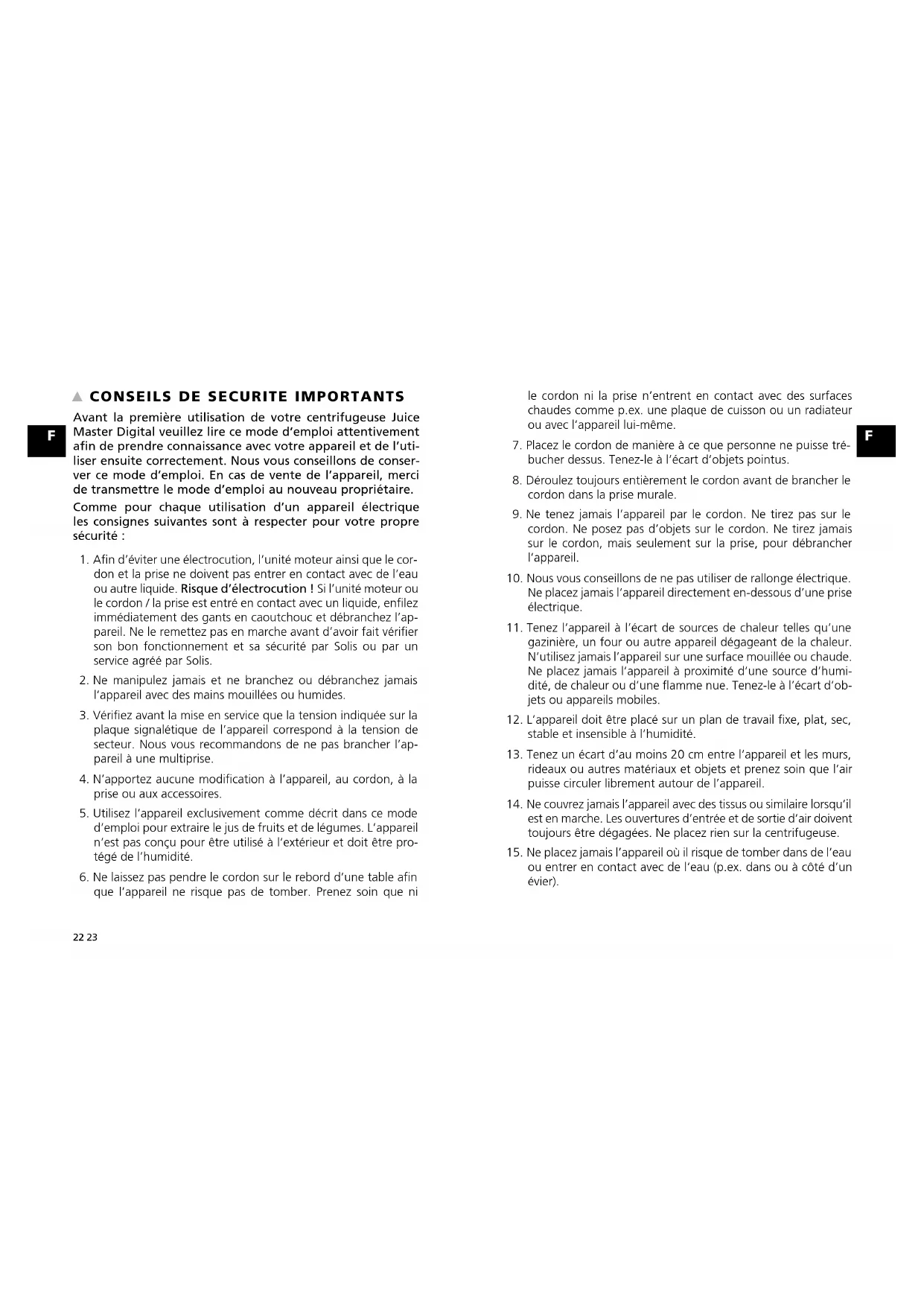 Avant la première utilisation de votre centrifugeuse Juice Master Digital veuillez lire ce mode d’emploi attentivement afin de prendre connaissance avec votre appareil et de l’uti- liser ensuite correctement. Nous vous conseillons de conser- ver ce mode d’emploi. En cas de vente de l’appareil, merci de transmettre le mode d’emploi au nouveau propriétaire. Comme pour chaque utilisation d’un appareil électrique les consignes suivantes sont à respecter pour votre propre sécurité :