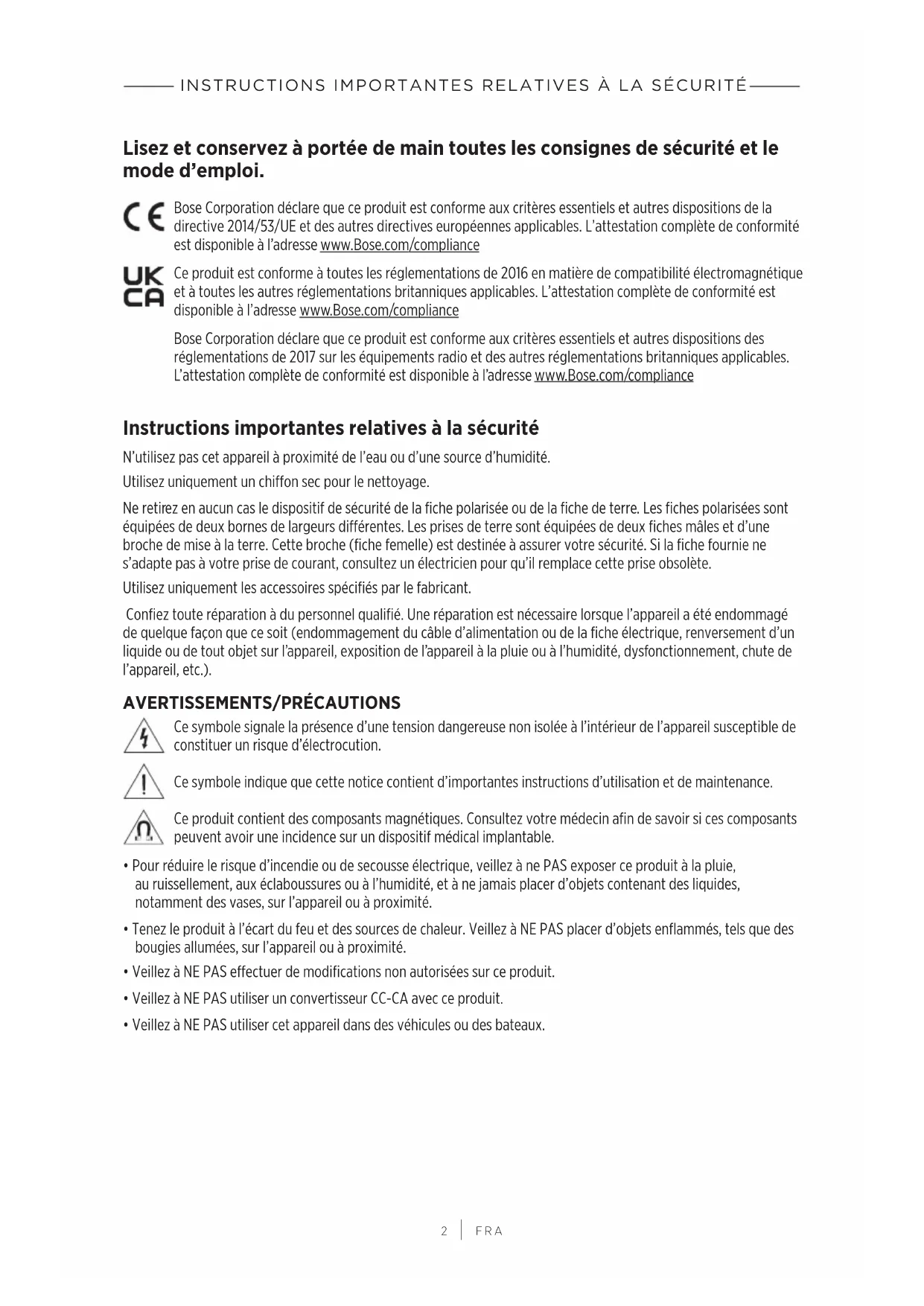 FRA Lisez et conservez à portée de main toutes les consignes de sécurité et le mode d’emploi. Bose Corporation déclare que ce produit est conforme aux critères essentiels et autres dispositions de la directive 2014/53/UE et des autres directives européennes applicables. L’attestation complète de conformité est disponible à l’adresse www.Bose.com/compliancewww.Bose.com/compliance Ce produit est conforme à toutes les réglementations de 2016 en matière de compatibilité électromagnétique et à toutes les autres réglementations britanniques applicables. L’attestation complète de conformité est disponible à l’adresse www.Bose.com/compliancewww.Bose.com/compliance Bose Corporation déclare que ce produit est conforme aux critères essentiels et autres dispositions des réglementations de 2017 sur les équipements radio et des autres réglementations britanniques applicables. L’attestation complète de conformité est disponible à l’adresse www.Bose.com/compliancewww.Bose.com/compliance Instructions importantes relatives à la sécurité N’utilisez pas cet appareil à proximité de l’eau ou d’une source d’humidité. Utilisez uniquement un chiffon sec pour le nettoyage. Ne retirez en aucun cas le dispositif de sécurité de la fiche polarisée ou de la fiche de terre. Les fiches polarisées sont équipées de deux bornes de largeurs différentes. Les prises de terre sont équipées de deux fiches mâles et d’une broche de mise à la terre. Cette broche (fiche femelle) est destinée à assurer votre sécurité. Si la fiche fournie ne s’adapte pas à votre prise de courant, consultez un électricien pour qu’il remplace cette prise obsolète. Utilisez uniquement les accessoires spécifiés par le fabricant. Confiez toute réparation à du personnel qualifié. Une réparation est nécessaire lorsque l’appareil a été endommagé de quelque façon que ce soit (endommagement du câble d’alimentation ou de la fiche électrique, renversement d’un liquide ou de tout objet sur l’appareil, exposition de l’appareil à la pluie ou à l’humidité, dysfonctionnement, chute de l’appareil, etc.).