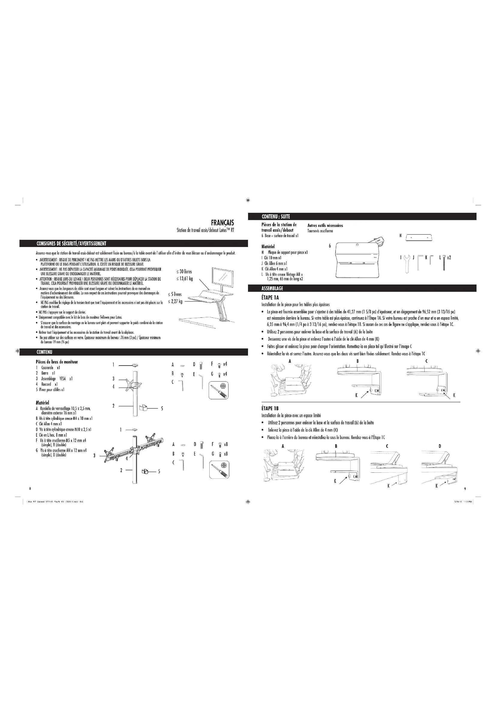 - AVERTISSEMENT: RISQUE DE PINCEMENT ! NE PAS METTRE LES MAINS OU D’AUTRES OBJETS SOUS LA PLATEFORME OU LE BRAS PENDANT L’UTILISATION. IL EXISTE UN RISQUE DE BLESSURE GRAVE. • AVERTISSEMENT: NE PAS DÉPASSER LA CAPACITÉ MAXIMALE DE POIDS INDIQUÉE. CELA POURRAIT PROVOQUER UNE BLESSURE GRAVE OU ENDOMMAGER LE MATÉRIEL.• ATTENTION: RISQUE LORS DU LEVAGE! DEUX PERSONNES SONT NÉCESSAIRES POUR DÉPLACER LA STATION DE TRAVAIL. CELA POURRAIT PROVOQUER UNE BLESSURE GRAVE OU ENDOMMAGER LE MATÉRIEL.• Assurez-vous que les longueurs de câble sont assez longues et suivez les instructions de ce manuel en matière d’acheminement des câbles. Le non-respect de ces instructions pourrait provoquer des dommages de l'équipement ou des blessures.