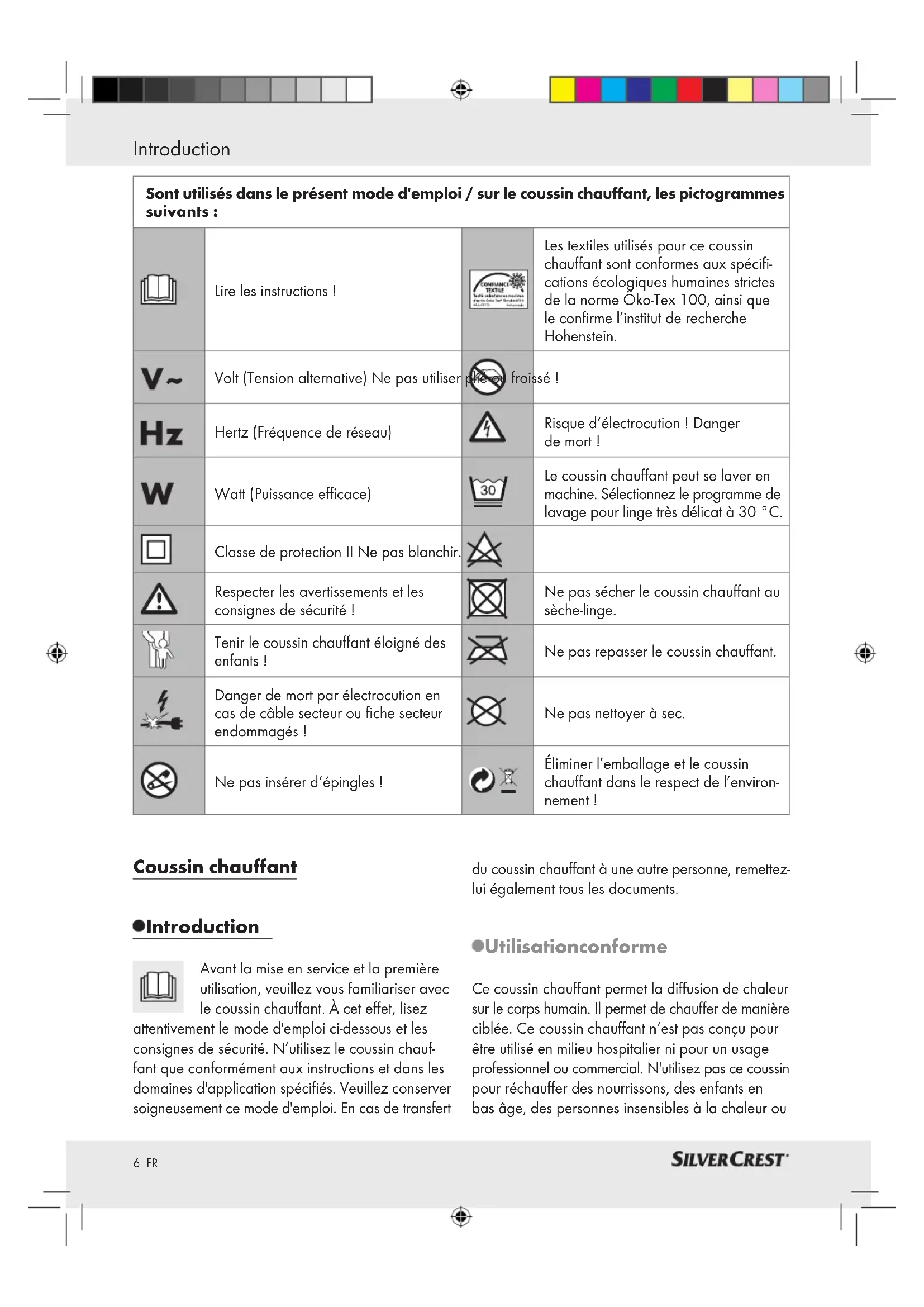 5 FR Table des matières Introduction Utilisation conforme ............................................................................................................................Page 6 Description des pièces et éléments ....................................................................................................Page 7 Fourniture ............................................................................................................................................. Page 7 Données techniques ............................................................................................................................ Page 7 Consignes de sécurité importantes ...........................................................................Page 7 Système de sécurité ...............................................................................................................Page 9 Mise en service Activation / désactivation / sélection de la température ................................................................... Page 9 Niveaux de température ....................................................................................................................Page 10 Arrêt automatique ...............................................................................................................................Page 10 Nettoyage et entretien ........................................................................................................ Page 10 Rangement.....................................................................................................................................Page 11 Élimination ......................................................................................................................................Page 11 Garantie / Service .....................................................................................................................Page 11 Déclaration de conformité ................................................................................................ Page 126 FR Introduction Coussin chauffant Introduction Avant la mise en service et la première utilisation, veuillez vous familiariser avec le coussin chauffant. À cet effet, lisez attentivement le mode d'emploi ci-dessous et les consignes de sécurité. N’utilisez le coussin chauf- fant que conformément aux instructions et dans les domaines d'application spécifiés. Veuillez conserver soigneusement ce mode d'emploi. En cas de transfert du coussin chauffant à une autre personne, remettez- lui également tous les documents. Utilisation conforme Ce coussin chauffant permet la diffusion de chaleur sur le corps humain. Il permet de chauffer de manière ciblée. Ce coussin chauffant n‘est pas conçu pour être utilisé en milieu hospitalier ni pour un usage professionnel ou commercial. N'utilisez pas ce coussin pour réchauffer des nourrissons, des enfants en bas âge, des personnes insensibles à la chaleur ou Sont utilisés dans le présent mode d'emploi / sur le coussin chauffant, les pictogrammes suivants: Lire les instructions! Les textiles utilisés pour ce coussin chauffant sont conformes aux spécifi- cations écologiques humaines strictes de la norme Öko-Tex 100, ainsi que le confirme l’institut de recherche Hohenstein. Volt (Tension alternative) Ne pas utiliser plié ou froissé! Hertz (Fréquence de réseau) Risque d‘électrocution! Danger de mort! Watt (Puissance efficace) Le coussin chauffant peut se laver en machine. Sélectionnez le programme de lavage pour linge très délicat à 30 °C. Classe de protection II Ne pas blanchir. Respecter les avertissements et les consignes de sécurité! Ne pas sécher le coussin chauffant au sèche-linge. Tenir le coussin chauffant éloigné des enfants! Ne pas repasser le coussin chauffant. Danger de mort par électrocution en cas de câble secteur ou fiche secteur endommagés! Ne pas nettoyer à sec. Ne pas insérer d‘épingles! Éliminer l’emballage et le coussin chauffant dans le respect de l’environ- nement!7 FR Introduction / Consignes de sécurité importantes affaiblies des autres et ni d’animaux non plus. Toute autre utilisation que celle décrite auparavant ou toute modification du coussin chauffant est interdite et peut se traduire par des blessures et / ou endom- mager le coussin chauffant. Le fabricant décline toute responsabilité en cas de dégâts issus d’une utilisation non conforme. Description des pièces et éléments