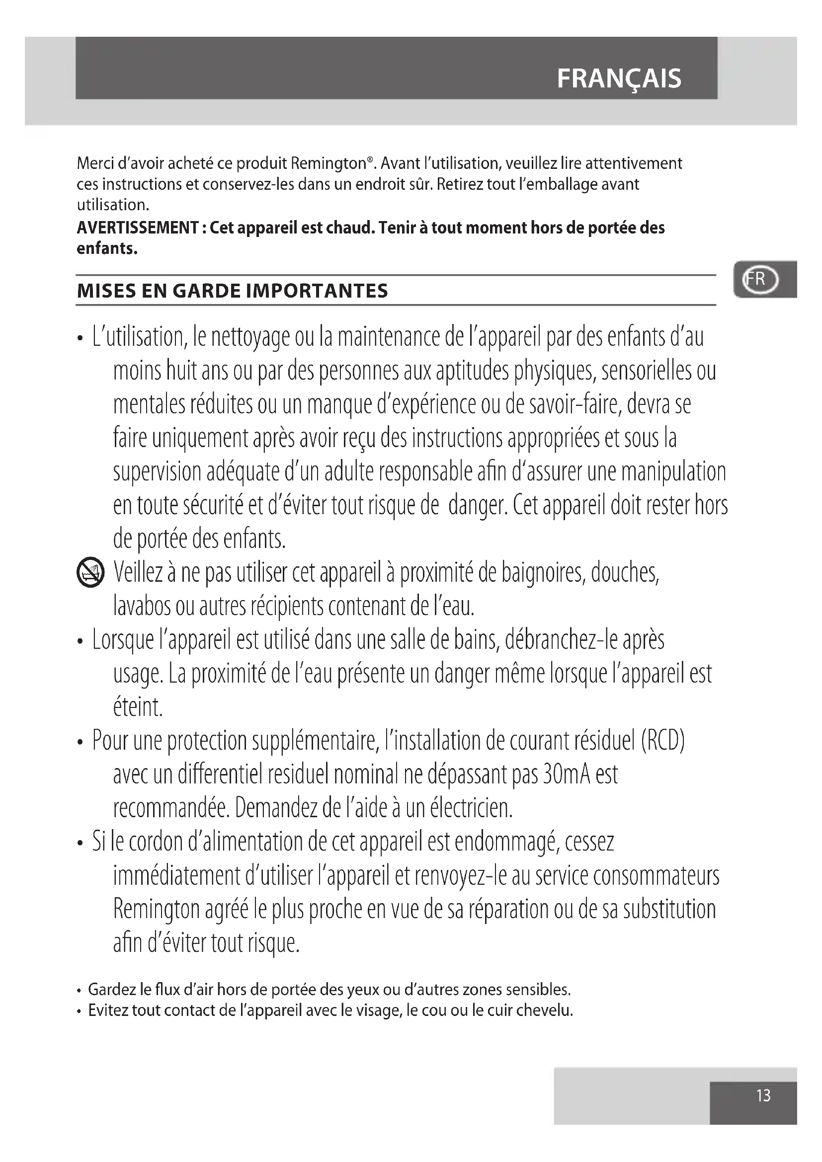- Si le cordon d’alimentation de cet appareil est endommagé, cessez immédiatement d’utiliser l’appareil et renvoyez-le au service consommateurs Remington agréé le plus proche en vue de sa réparation ou de sa substitution afin d’éviter tout risque.