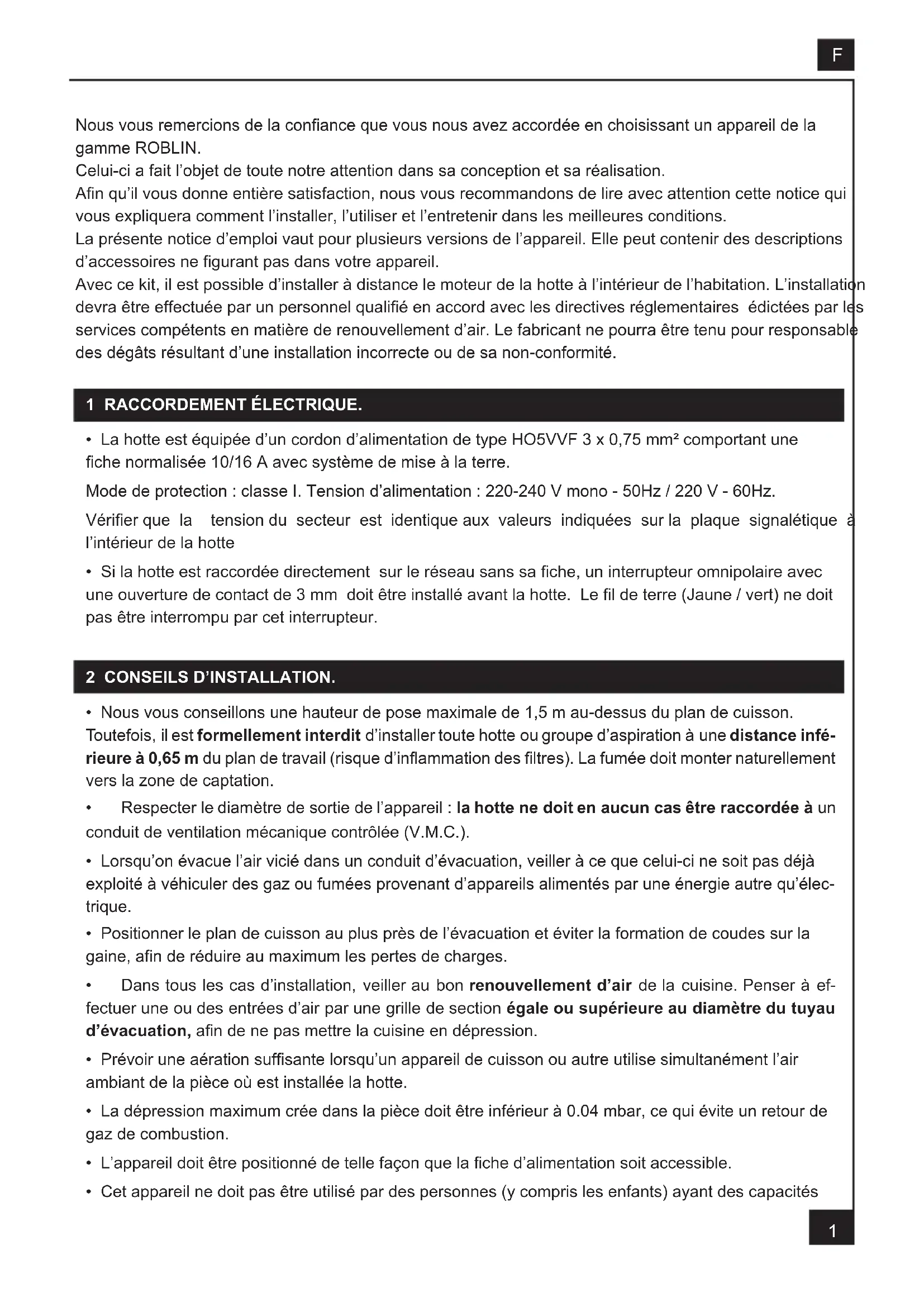 Nous vous remercions de la conance que vous nous avez accordée en choisissant un appareil de la gamme ROBLIN. Celui-ci a fait l’objet de toute notre attention dans sa conception et sa réalisation. An qu’il vous donne entière satisfaction, nous vous recommandons de lire avec attention cette notice qui vous expliquera comment l’installer, l’utiliser et l’entretenir dans les meilleures conditions. La présente notice d’emploi vaut pour plusieurs versions de l’appareil. Elle peut contenir des descriptions d’accessoires ne gurant pas dans votre appareil. Avec ce kit, il est possible d’installer à distance le moteur de la hotte à l’intérieur de l’habitation. L’installation devra être effectuée par un personnel qualié en accord avec les directives réglementaires édictées par les services compétents en matière de renouvellement d’air. Le fabricant ne pourra être tenu pour responsable des dégâts résultant d’une installation incorrecte ou de sa non-conformité. 1 RACCORDEMENT ÉLECTRIQUE.