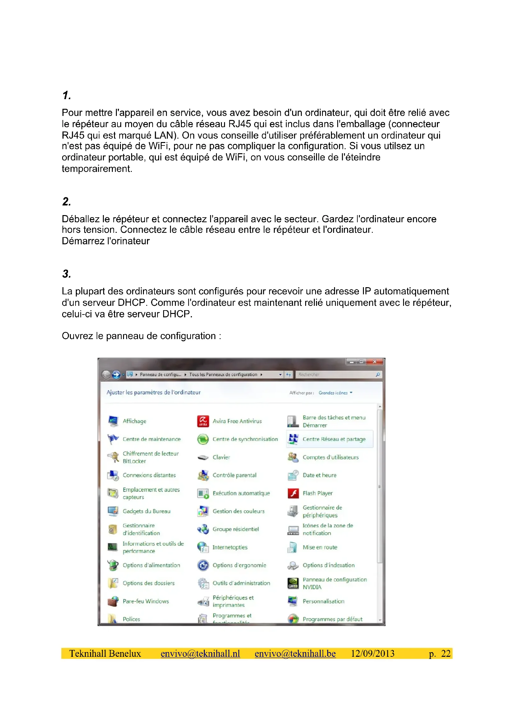 La plupart des ordinateurs sont configurés pour recevoir une adresse IP automatiquement d'un serveur DHCP. Comme l'ordinateur est maintenant relié uniquement avec le répéteur, celui-ci va être serveur DHCP. Ouvrez le panneau de configuration : Teknihall Benelux envivo@teknihall.nl envivo@teknihall.be 12/09/2013 p. 224. Double-cliquez 'Centre Réseau et Partage'. L'écran suivant apparaît : Si un triangle orange apparaît entre (cet ordinateur) et le réseau, attendez jusque ce triangle disparaît. A ce moment votre ordinateur a reçu une adresse IP comme