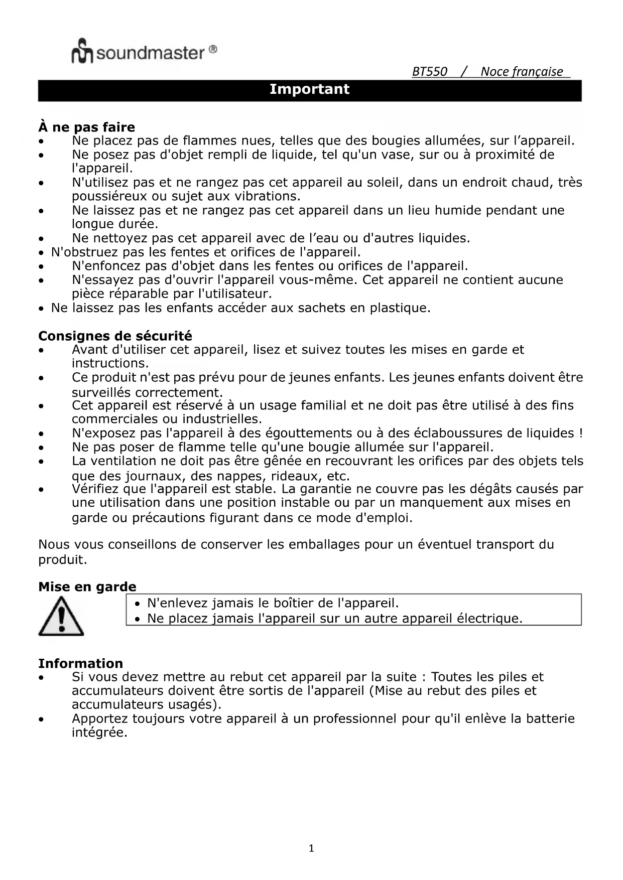 MODE D'EMPLOI BT550 Soundmaster