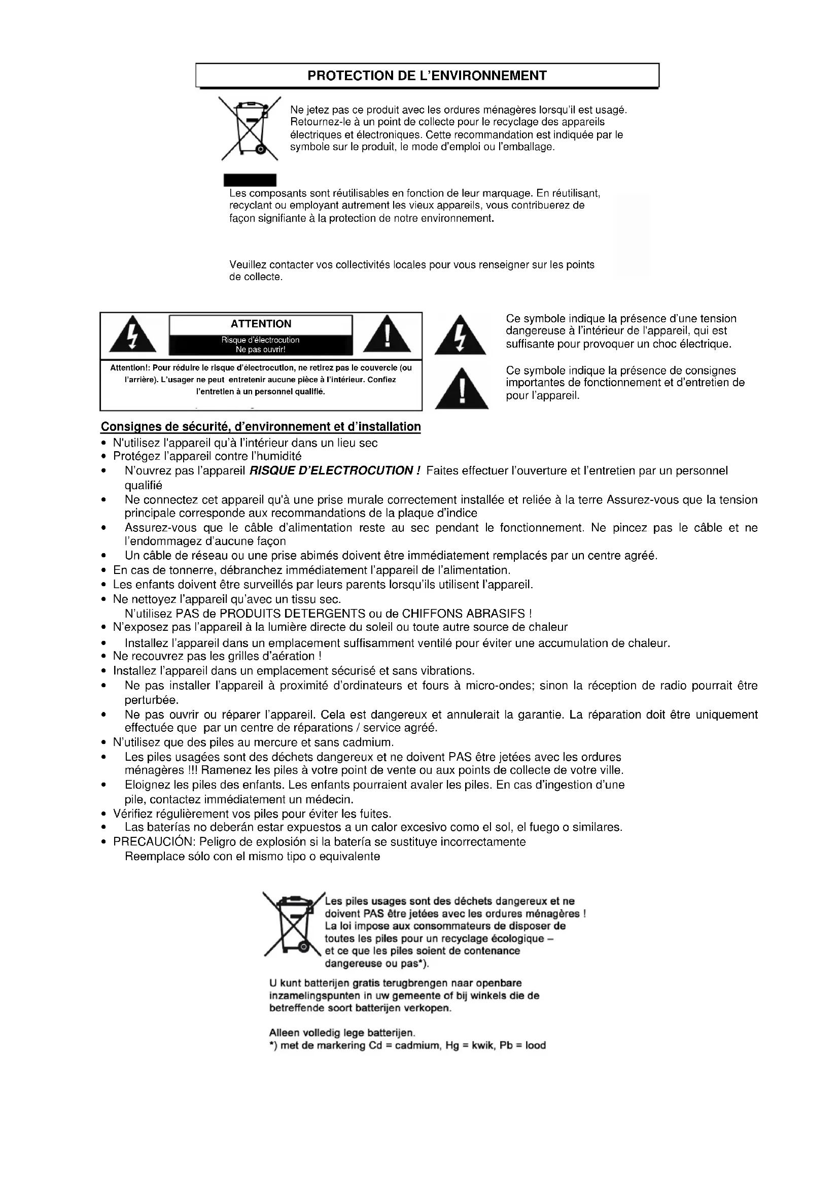 Attention!: Pour réduire le risque d'électrocution, ne retirez pas le couvercle (ou l'arrière). L'usager ne peut entretenir aucune pièce à l'Intérieur. Conflez l'entretien à un personnel qualifié.
