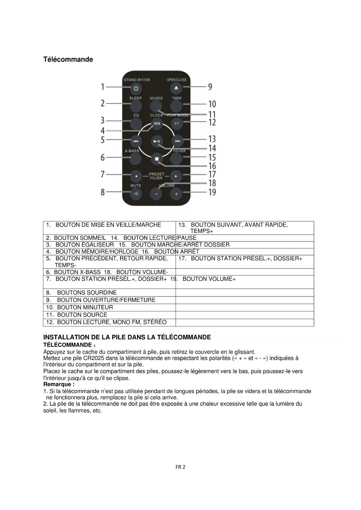 2. La pile de la télécommande ne doit pas être exposée à une chaleur excessive telle que la lumière du