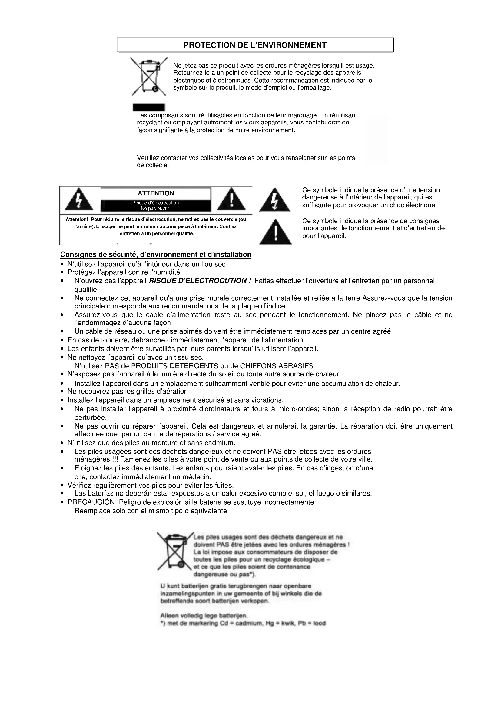 Attention: Pour réduire le risque d'électrocution, ne retirez pas le couvercle (ou l'arrête). L'usage ne peut entrenir aucune piece à l'Intérieur. Confiez l'entretien à un personnel qualifié.