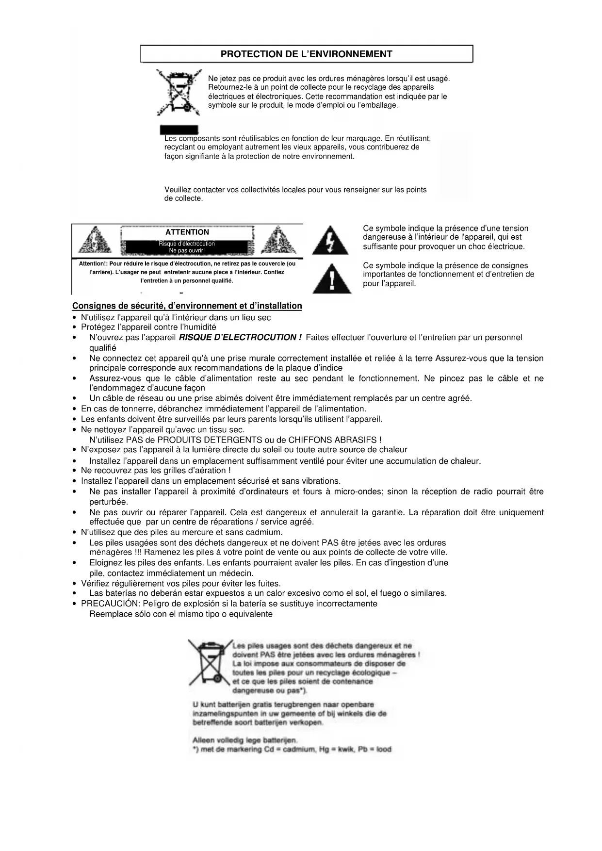 Ne jetez pas ce produit avec les ordures ménagères lorsqu’il est usagé. Retournez-le à un point de collecte pour le recyclage des appareils électriques et électroniques. Cette recommandation est indiquée par le symbole sur le produit, le mode d’emploi ou l’emballage. Les composants sont réutilisables en fonction de leur marquage. En réutilisant, recyclant ou employant autrement les vieux appareils, vous contribuerez de façon signifiante à la protection de notre environnement. Veuillez contacter vos collectivités locales pour vous renseigner sur les points de collecte. ATTENTION Risque d’électrocution Ne pas ouvrir!