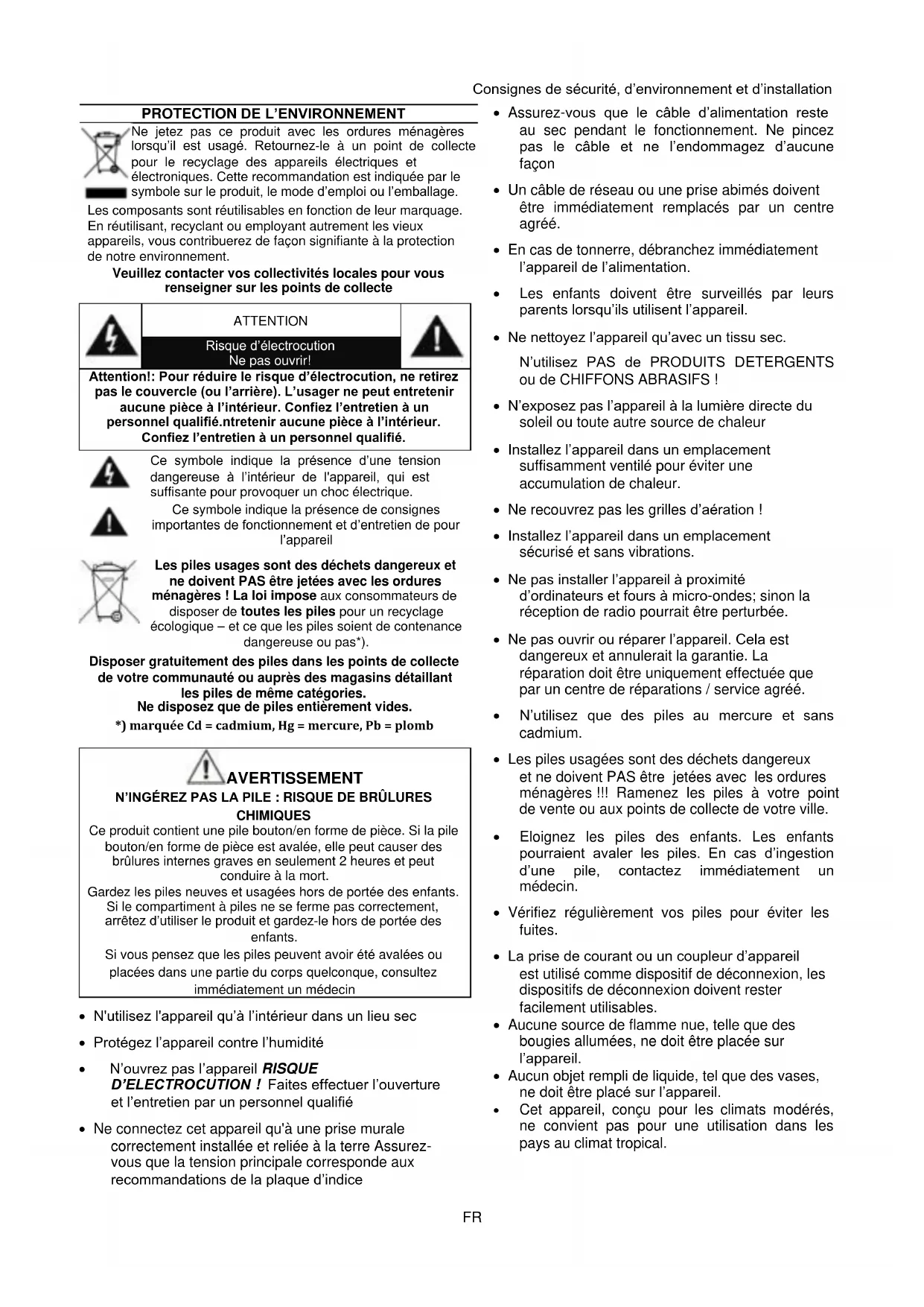 Assurez-vous que le câble d'alimentation reste au sec pendant le fonctionnement. Ne pincez pas le câble et ne l'endommagez d'aucune façon - Un câble de réseau ou une prise abîmés doivent être immédiatement remplacés par un centre agréé. - En cas de tonnerre, débranchez immédiatement l'appareil de l'alimentation. - Les enfants doivent être surveillés par leurs parents lorsqu'ils utilisent l'appareil. - Ne nettoyez l'appareil qu'avec un tissu sec. N'utilisez PAS de PRODUITS DETERGENTS ou de CHIFFONS ABRASIFS! - N'exposez pas l'appareil à la lumière directe du soleil ou toute autre source de chaleur - Installez l'appareil dans un emplacement suffisamment ventilé pour éviter une accumulation de chaleur. - Ne recouvrez pas les grilles d'aération! - Installez l'appareil dans un emplacement sécurisé et sans vibrations. - Ne pas installer l'appareil à proximité d'ordinateurs et jours à micro-ondes; sinon la réception de radio pourrait être perturbée. - Ne pas ouvrir ou réparer l'appareil. Cela est dangereux et annulerait la garantie. La réparation doit être uniquement effectuée que par un centre de réparations / service agréé. - N'utilisez que des piles au mercure et sans cadmium. - Les piles usagées sont des déchets dangereux et ne doivent PAS être jetées avec les ordures ménagères!!! Ramenez les piles à votre point de vente ou aux points de collecte de votre ville. - Éloignez les piles des enfants. Les enfants pourraient avaler les piles. En cas d'ingestion d'une pile, contactez immédiatement un médecin. - Vérifiez régulièrement vos piles pour éviter les fuites. - La prise de courant ou un coupleur d'appareil est utilisé comme dispositif de déconnexion, les dispositifs de déconnexion doivent rester facilement utilisables. - Aucune source de flamme nue, telle que des bougies allumées, ne doit être placée sur l'appareil. - Aucun objet rempli de liquide, tel que des vases, ne doit être placé sur l'appareil. - Cet appareil, conçu pour les climats modérés, ne convient pas pour une utilisation dans les pays au climat tropical.