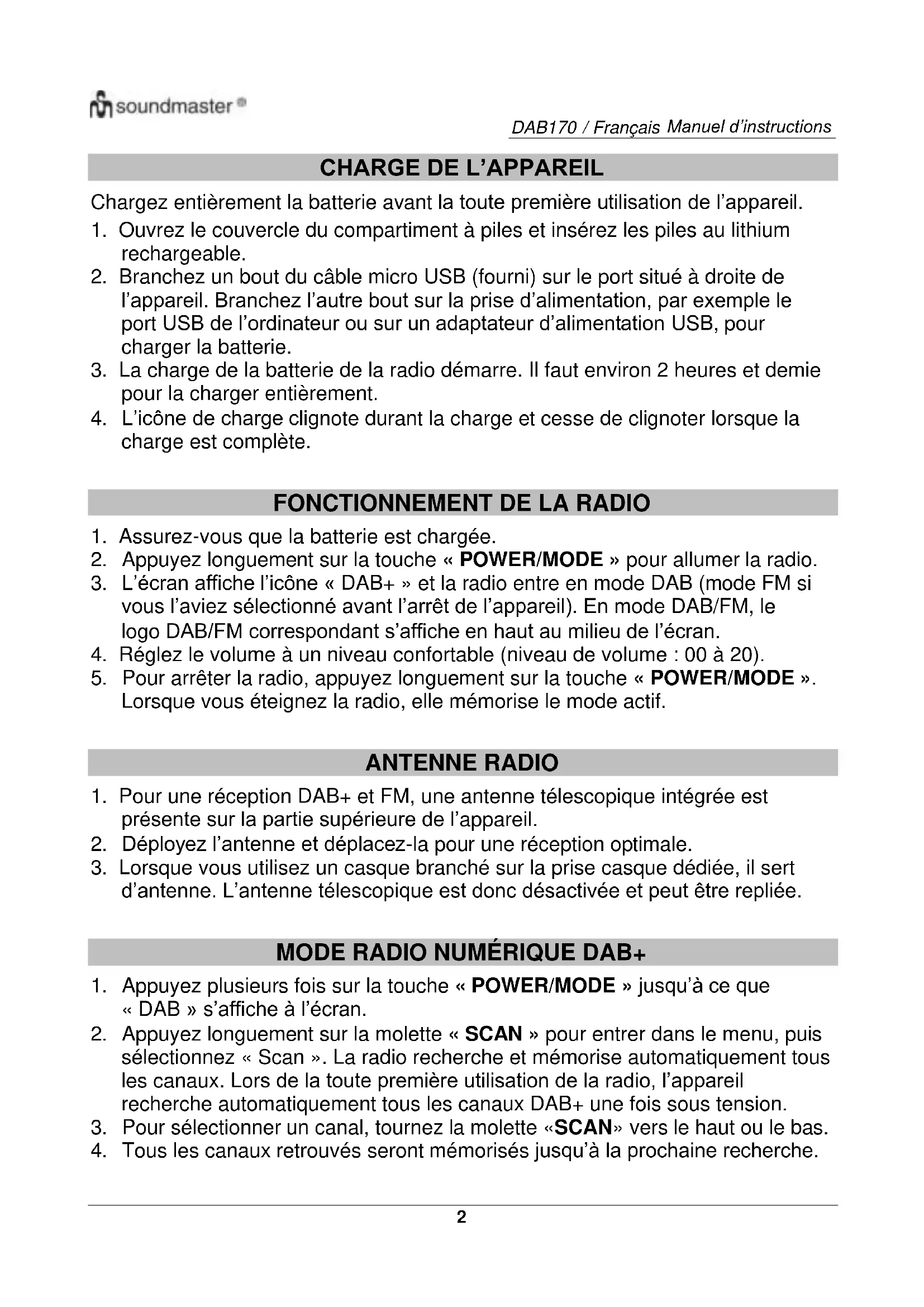 Téléchargez la notice de votre Radio au format PDF gratuitement ! Retrouvez votre notice DAB170SW - Soundmaster et reprennez votre appareil électronique en main. Sur cette page sont publiés tous les documents nécessaires à l'utilisation de votre appareil DAB170SW de la marque Soundmaster.