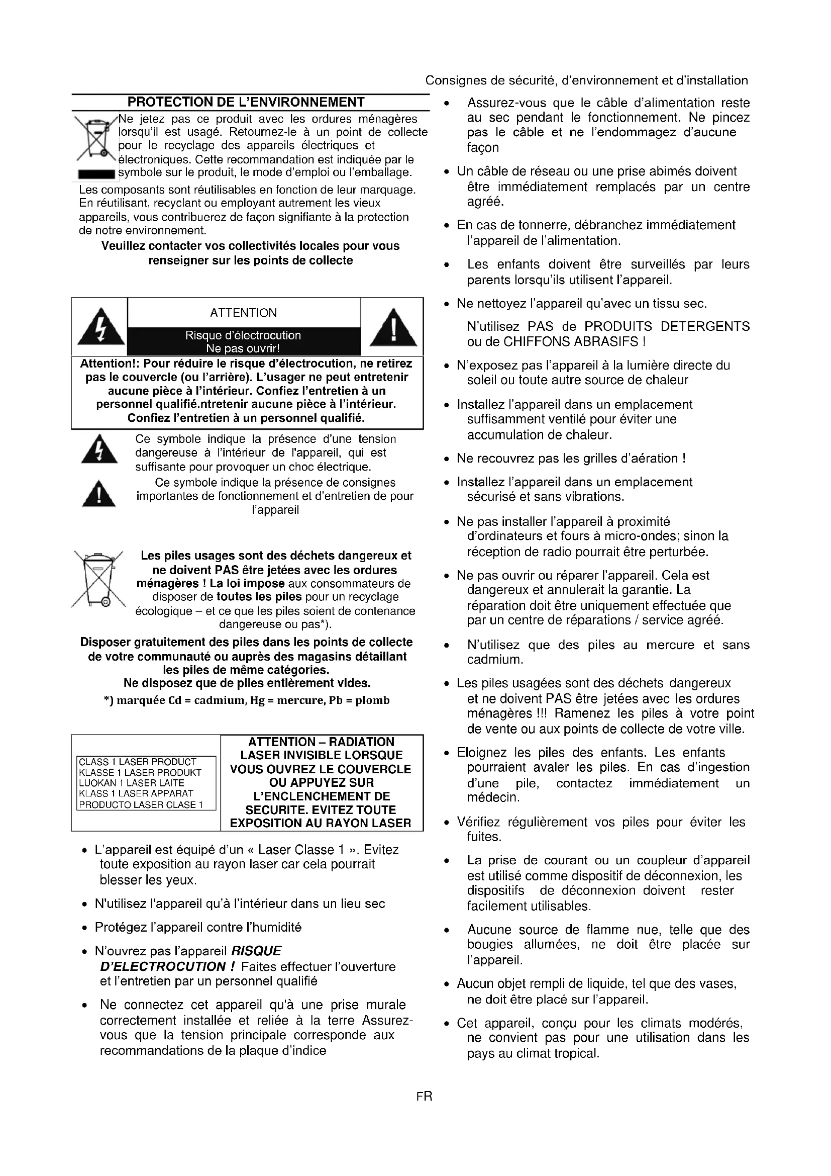 - L'appareil est équipé d'un « Laser Classe 1 ». Evitez toute exposition au rayon laser car cela pourrait blesser les yeux.