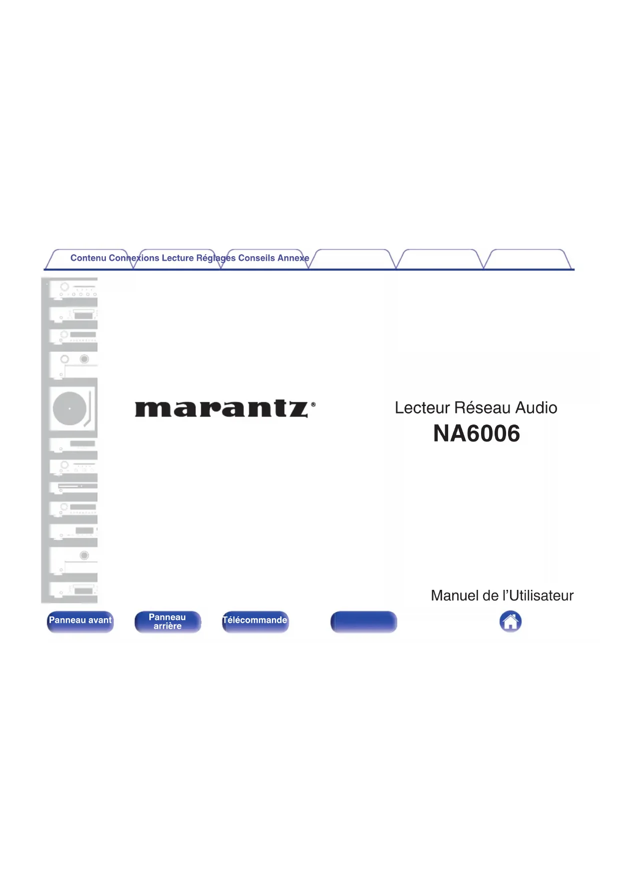 Téléchargez la notice de votre Récepteur de musique au format PDF gratuitement ! Retrouvez votre notice NA6006 - MARANTZ et reprennez votre appareil électronique en main. Sur cette page sont publiés tous les documents nécessaires à l'utilisation de votre appareil NA6006 de la marque MARANTZ.