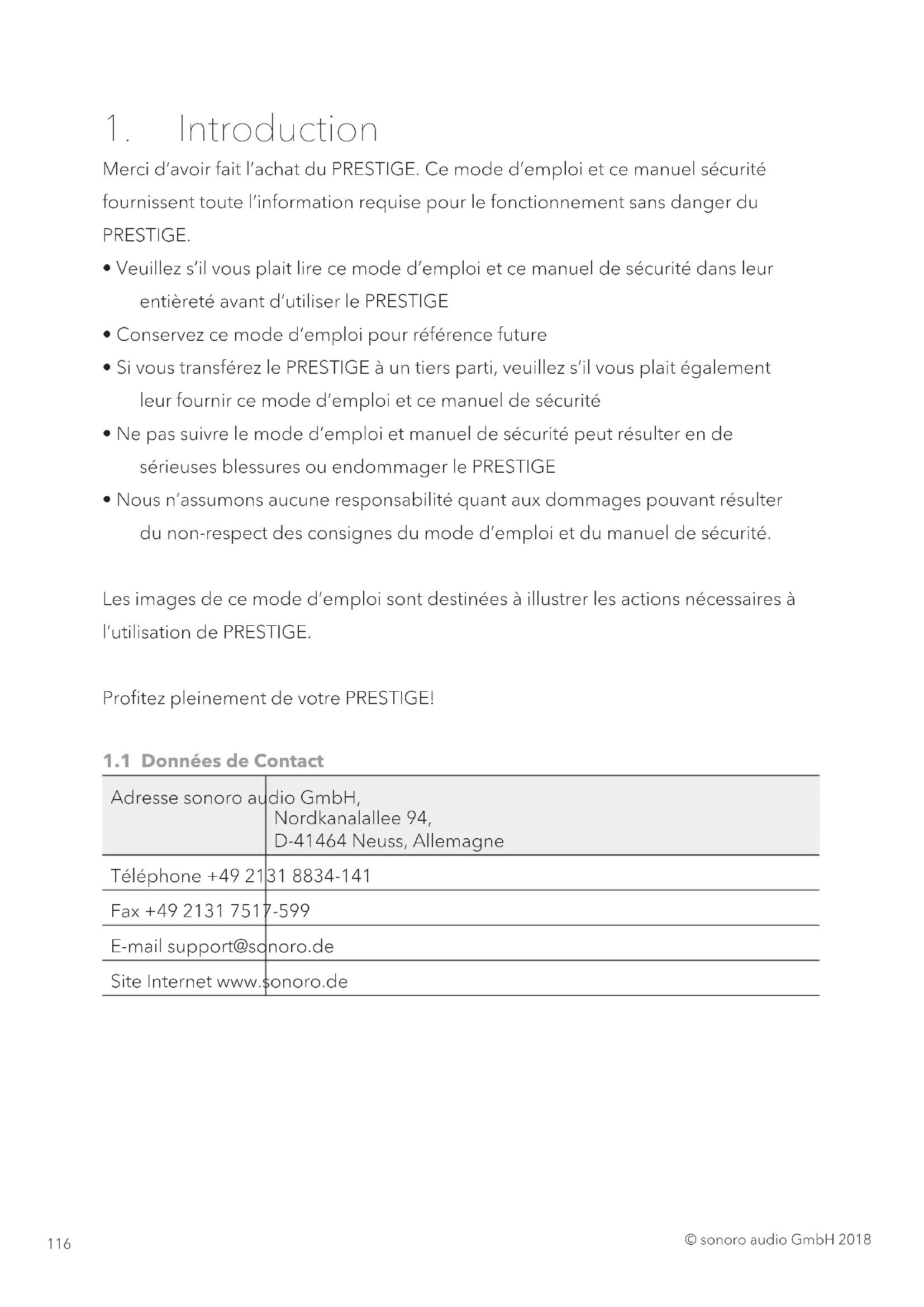 - Sont exclus de la garantie les piles, les dégâts causés par une utilisation inadéquate, l’usure normale ainsi que les défectuosités n’affectant la valeur ou l’utilisation du PRESTIGE que de façon minimale. Toute autre modification n’étant pas effectuée par notre centre de service autorisé invaliderait également la garantie.© sonoro audio GmbH 2018