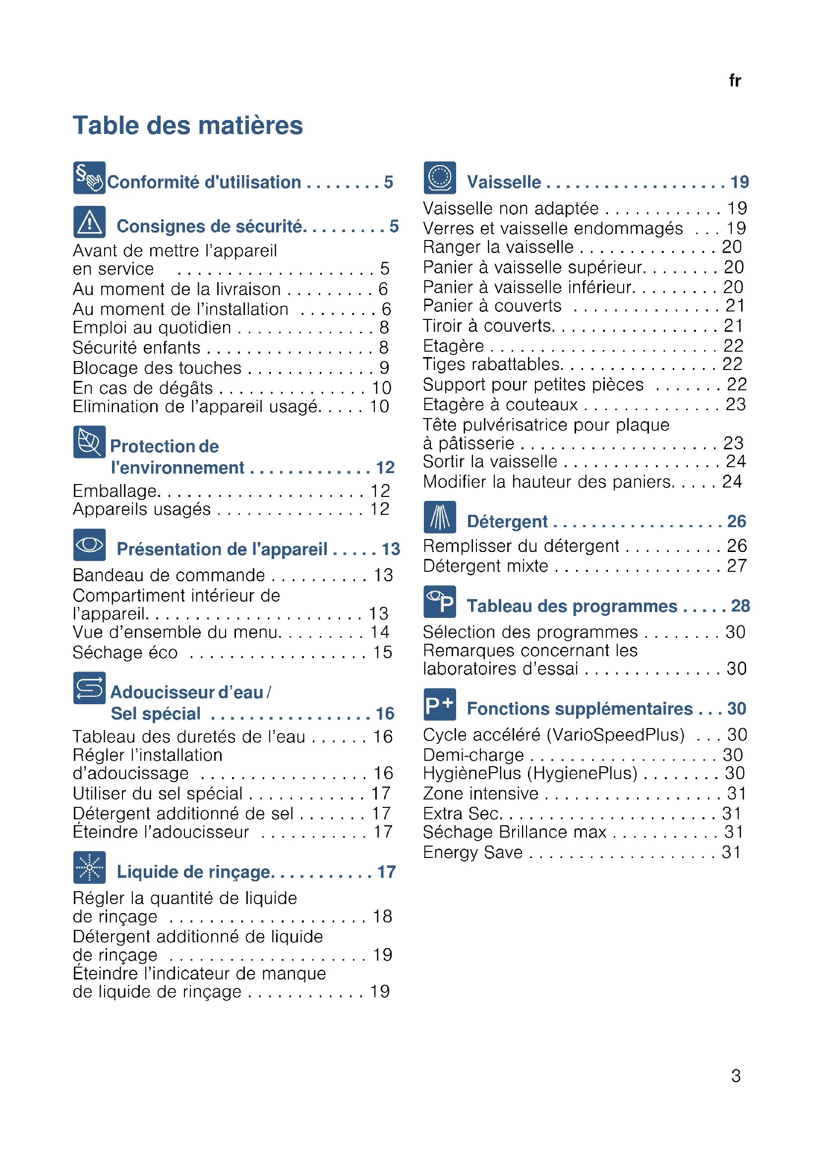 - Présentation de l'appareil . . . . . 13 Bandeau de commande . . . . . . . . . . 13 Compartiment intérieur de l’appareil. . . . . . . . . . . . . . . . . . . . . . 13 Vue d’ensemble du menu. . . . . . . . . 14 Séchage éco . . . . . . . . . . . . . . . . . . 15 + Adoucisseur d’eau / Sel spécial . . . . . . . . . . . . . . . . . 16 Tableau des duretés de l’eau . . . . . . 16 Régler l’installation d’adoucissage . . . . . . . . . . . . . . . . . 16 Utiliser du sel spécial . . . . . . . . . . . . 17 Détergent additionné de sel . . . . . . . 17 Éteindre l’adoucisseur . . . . . . . . . . . 17 , Liquide de rinçage. . . . . . . . . . . 17 Régler la quantité de liquide de rinçage . . . . . . . . . . . . . . . . . . . . 18 Détergent additionné de liquide de rinçage . . . . . . . . . . . . . . . . . . . . 19 Éteindre l’indicateur de manque de liquide de rinçage . . . . . . . . . . . . 19 - Vaisselle . . . . . . . . . . . . . . . . . . . 19 Vaisselle non adaptée . . . . . . . . . . . . 19 Verres et vaisselle endommagés . . . 19 Ranger la vaisselle . . . . . . . . . . . . . . 20 Panier à vaisselle supérieur. . . . . . . . 20 Panier à vaisselle inférieur. . . . . . . . . 20 Panier à couverts . . . . . . . . . . . . . . . 21 Tiroir à couverts. . . . . . . . . . . . . . . . . 21 Etagère . . . . . . . . . . . . . . . . . . . . . . . 22 Tiges rabattables. . . . . . . . . . . . . . . . 22 Support pour petites pièces . . . . . . . 22 Etagère à couteaux . . . . . . . . . . . . . . 23 Tête pulvérisatrice pour plaque à pâtisserie . . . . . . . . . . . . . . . . . . . . 23 Sortir la vaisselle . . . . . . . . . . . . . . . . 24 Modifier la hauteur des paniers. . . . . 24 . Détergent . . . . . . . . . . . . . . . . . . 26 Remplisser du détergent . . . . . . . . . . 26 Détergent mixte . . . . . . . . . . . . . . . . . 27 / Tableau des programmes . . . . . 28 Sélection des programmes . . . . . . . . 30 Remarques concernant les laboratoires d’essai . . . . . . . . . . . . . . 30 0 Fonctions supplémentaires . . . 30 Cycle accéléré (VarioSpeedPlus) . . . 30 Demi-charge . . . . . . . . . . . . . . . . . . . 30 HygiènePlus (HygienePlus) . . . . . . . . 30 Zone intensive . . . . . . . . . . . . . . . . . . 31 Extra Sec. . . . . . . . . . . . . . . . . . . . . . 31 Séchage Brillance max . . . . . . . . . . . 31 Energy Save . . . . . . . . . . . . . . . . . . . 31fr