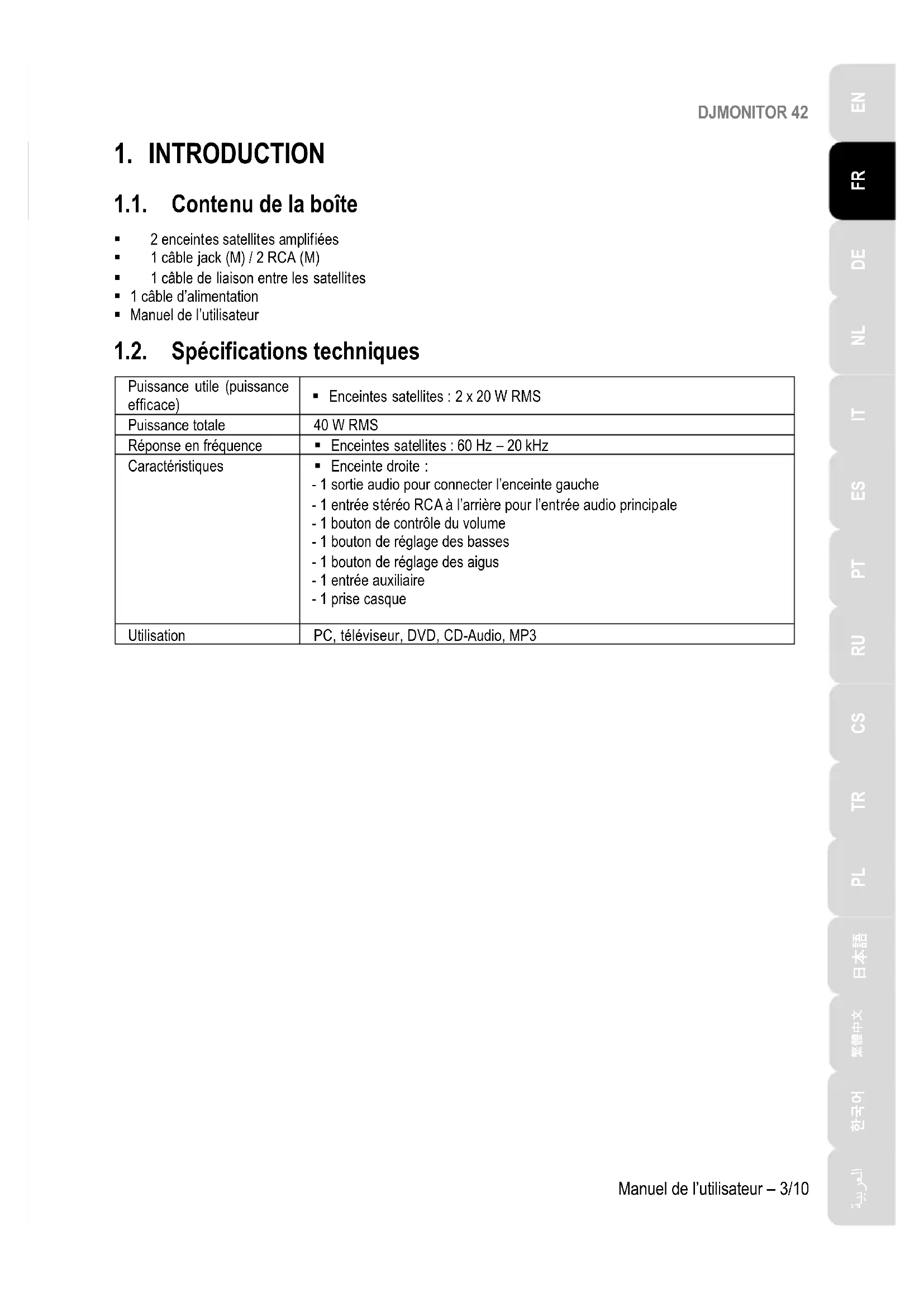 1.1. Contenu de la boîte 2 enceintes satellites amplifiées 1 câble jack (M) / 2 RCA (M) 1 câble de liaison entre les satellites 1 câble d’alimentation Manuel de l’utilisateur 1.2. Spécifications techniques Puissance utile (puissance efficace) Enceintes satellites : 2 x 20 W RMS Puissance totale 40 W RMS Réponse en fréquence Enceintes satellites : 60 Hz – 20 kHz Caractéristiques Enceinte droite : - 1 sortie audio pour connecter l’enceinte gauche - 1 entrée stéréo RCA à l’arrière pour l’entrée audio principale - 1 bouton de contrôle du volume - 1 bouton de réglage des basses - 1 bouton de réglage des aigus - 1 entrée auxiliaire - 1 prise casque Utilisation PC, téléviseur, DVD, CD-Audio, MP3DJMONITOR 42 4/10 – Manuel de l’utilisateur 1.3. Recommandations - Placez vos enceintes satellites sur une surface plane pour éviter tout risque de chute. - N’ouvrez en aucun cas votre kit d’enceintes, vous risqueriez d’endommager les composants internes. - Ce kit d’enceintes est destiné à une utilisation sous climat tempéré. - Pour prévenir tout risque d’incendie ou de décharge électrique, tenez votre kit d’enceintes éloigné : - de la pluie ou de l’humidité, de tout fluide (eau, produits chimiques ou tout autre liquide), - de sources de chaleur telles que radiateurs, cuisinières ou tout autre appareil émetteur de chaleur (y compris les amplificateurs), - des rayons directs du soleil. - Evitez d’exposer le kit d’enceintes à des égouttements d’eau ou à des éclaboussures. - Ne placez aucun objet rempli de liquide (verre, vase…) sur le kit d’enceintes. - Débranchez le cordon d’alimentation si vous prévoyez de ne pas utiliser le kit d’enceintes pendant une période prolongée. Pour débrancher le cordon d’alimentation, tirez sur la fiche. Ne tirez jamais sur le cordon proprement dit. - Veillez à ce que la prise d’alimentation du kit d’enceintes branchée sur le secteur reste facilement accessible. - Débranchez le kit d’enceintes avant tout nettoyage. Utilisez un chiffon humide et évitez l’usage d’aérosols. - La prise d’alimentation du kit sert de dispositif de mise hors tension et doit donc à tout moment être facilement accessible. - Les marquages se situent au dos des enceintes.