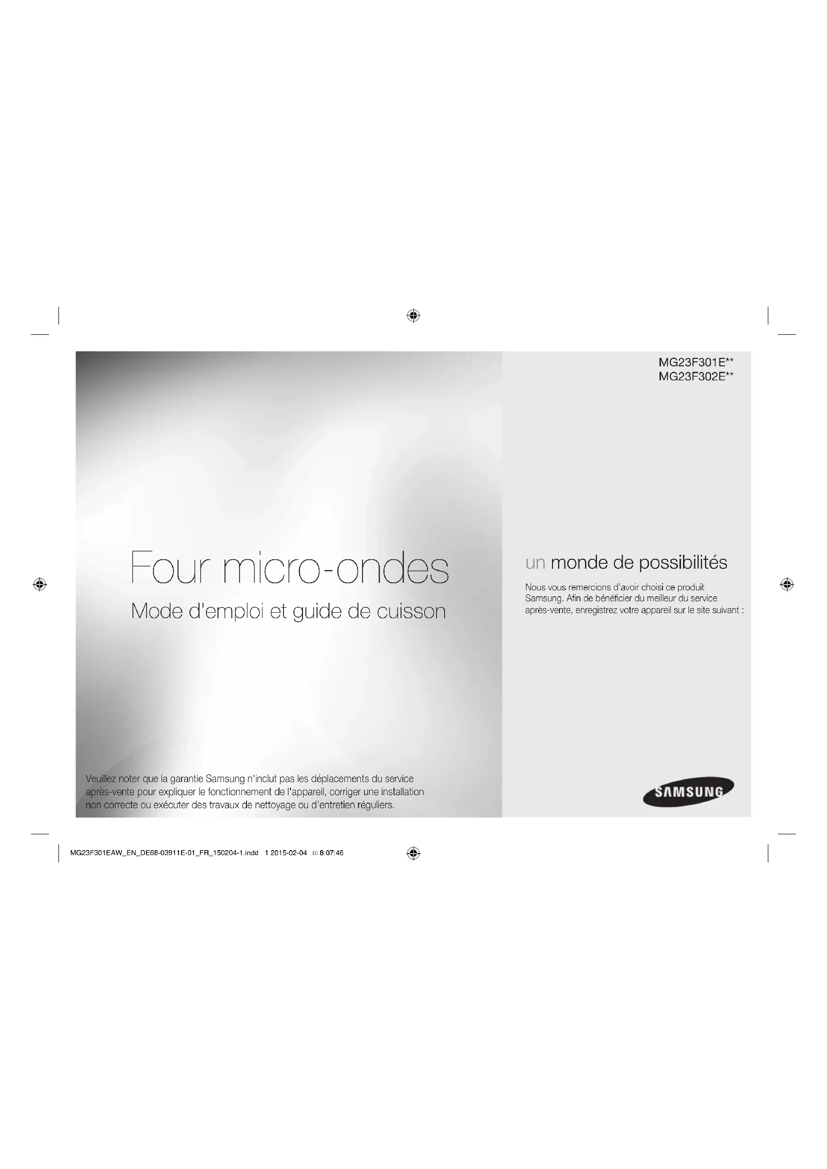un monde de possibilités Nous vous remercions d’avoir choisi ce produit Samsung. Afin de bénéficier du meilleur du service après-vente, enregistrez votre appareil sur le site suivant : Four micro-ondes Mode d'emploi et guide de cuisson MG23F301E** MG23F302E** Veuillez noter que la garantie Samsung n'inclut pas les déplacements du service après-vente pour expliquer le fonctionnement de l'appareil, corriger une installation non correcte ou exécuter des travaux de nettoyage ou d’entretien réguliers. MG23F301EAW_EN_DE68-03911E-01_FR_150204-1.indd 1 2015-02-04 8:07:462 FRANÇAIS