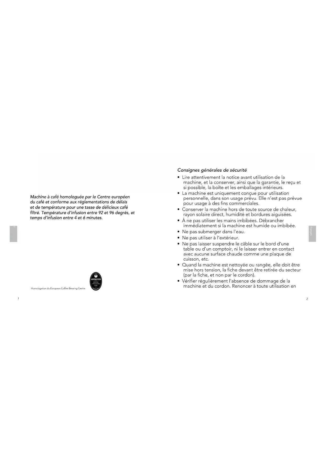 - Vérifier régulièrement l’absence de dommage de la machine et du cordon. Renoncer à toute utilisation en Homologation du European Coffee Brewing Centre Machine à café homologuée par le Centre européen du café et conforme aux réglementations de délais et de température pour une tasse de délicieux café filtré. Température d’infusion entre 92 et 96 degrés, et temps d’infusion entre 4 et 6 minutes.DanskDanskFrançais Français cas de dommage de la machine.