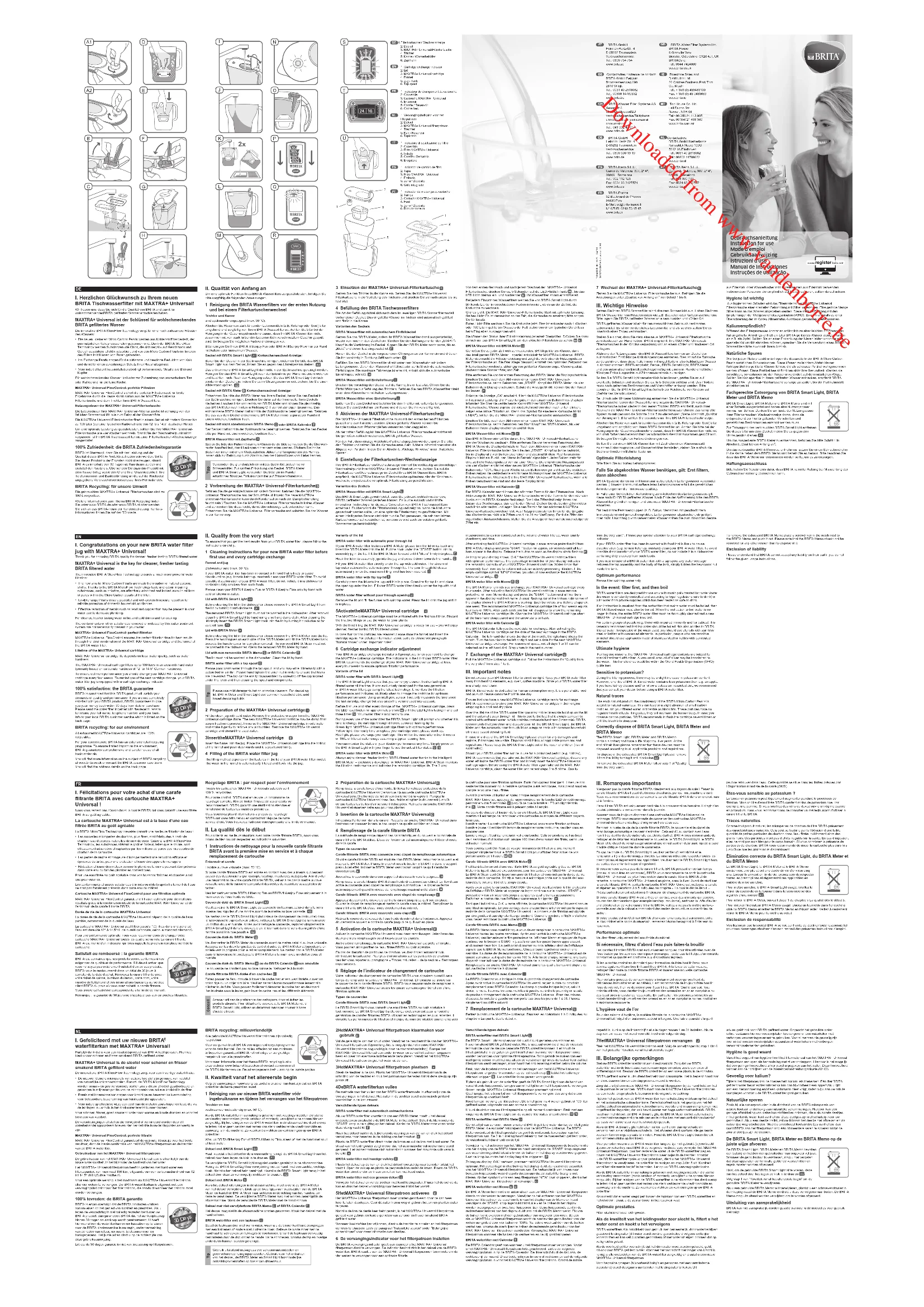 Um eine optimale Funktion Ihres BRITA Wasserfilters zu gewährleisten, befolgen Sie bitte sorgfältig die folgenden Anweisungen. 1 Reinigung des BRITA Wasserfilters vor der ersten Nutzung und bei einem FilterkartuschenwechselTrichter und Kannesind spülmaschinengeeignet (max. 50 °C). Wischen Sie Reste von stark färbenden Lebensmitteln (z.B. Ketchup oder Senf) bitte umgehend und sorgfältig von Ihrem BRITA Wasserfilter ab. Achten Sie bitte bei der Reinigung in der Geschirrspülmaschine darauf, dass Ihr BRITA Wasserfilter nicht zusammen mit von stark färbenden Lebensmitteln verschmutztem Geschirr gespült wird. So beugen Sie möglichen Farbveränderungen vor. Bitte reinigen Sie Ihren BRITA fill&enjoy Fun oder BRITA fill&enjoy Flow nur per Hand mit kaltem oder lauwarmem Wasser.Deckel mit BRITA Smart Light Kartuschenwechsel-Anzeige: Bevor Sie den Deckel in der Spülmaschine reinigen, entfernen Sie bitte das BRITA Smart Light aus dem Deckel, indem Sie es gegen den Uhrzeigersinn drehen. Das entnommene BRITA Smart Light darf nicht in der Spülmaschine gereinigt werden. Reinigen Sie das BRITA Smart Light nach der Entnahme per Hand mit einem weichen und feuchten Tuch. Nach der Reinigung setzen Sie das BRITA Smart Light einfach wieder in den Deckel ein, indem Sie es im Uhrzeigersinn so weit drehen, bis Sie einen Widerstand spüren. Deckel mit BRITA Meter Kartuschenwechsel-Anzeige:Entnehmen Sie bitte das BRITA Meter aus Ihrem Deckel, bevor Sie den Deckel in der Spülmaschine reinigen. Drücken Sie dafür auf der Innenseite Ihres Deckels die beiden Laschen links und rechts am BRITA Meter und kippen Sie gleichzeitig das BRITA Meter nach hinten in Richtung Griff zur vollständigen Entnahme. Das entnommene BRITA Meter darf nicht in der Spülmaschine gereinigt werden. Reinigen Sie das aus dem Deckel entnommene BRITA Meter immer separat per Hand mit einem weichen, feuchten Tuch.Deckel mit nicht abnehmbarem BRITA Memo oder BRITA Kalender Der Deckel darf nicht in der Spülmaschine gereinigt werden. Reinigen Sie den Deckel bitte per Hand mit einem weichen, feuchten Tuch.BRITA Wasserfilter mit Zapfhahn Spülen Sie bitte den Hahn mit warmem Wasser durch. Bitte schrauben Sie die Überwurf-mutter handfest fest, damit Leckagen sicher vermieden werden. Säubern Sie ihn bei Bedarf von innen mit einem Wattestäbchen. Ablauf und Komponenten des Hahnes lassen sich zur Reinigung durch Abschrauben des Hahnstückes vom Hebel trennen.Verwenden Sie grundsätzlich ein mildes Spülmittel, jedoch keine Scheuermittel. Zur sanften Entkalkung von Deckel, BRITA Meter und BRITA Smart Light verwenden Sie bitte ein im Handel erhältliches flüssiges Entkalkungsmittel auf Zitronensäurebasis. Tipp 2 Vorbereitung der MAXTRA+ Universal-Filterkartusche Befüllen Sie die gereinigte Kanne mit kaltem Wasser. Nehmen Sie die MAXTRA+ Universal-Filterkartusche aus der Schutzfolie. (Hinweis: Die neue MAXTRA+ Universal-Filterkartusche kann durch Kondensation nach der Dampfbehandlung feucht sein.) Tauchen Sie die MAXTRA+ Universal-Filterkartusche in kaltes Wasser und schwenken Sie diese leicht, damit überschüssige Luft entweichen kann. Entnehmen Sie die MAXTRA+ Universal-Filterkartusche und schütten Sie das Wasser in der Kanne weg. Recyclage BRITA : par respect pour l’environnementToutes les cartouches MAXTRA+ Universals saturées sont 100 % recyclables.Pour votre confort, BRITA met en œuvre un programme de recyclage complet. Afin de limiter l’impact de ses produits sur l’environnement, BRITA garantit une réutilisation étendue et minutieuse de toutes les matières premières.Vous trouverez plus d’informations à propos du recyclage BRITA sur www.brita.net ou en contactant l’équipe de notre service client. Vous trouverez l’adresse correspondante à la fin de ce manuel.