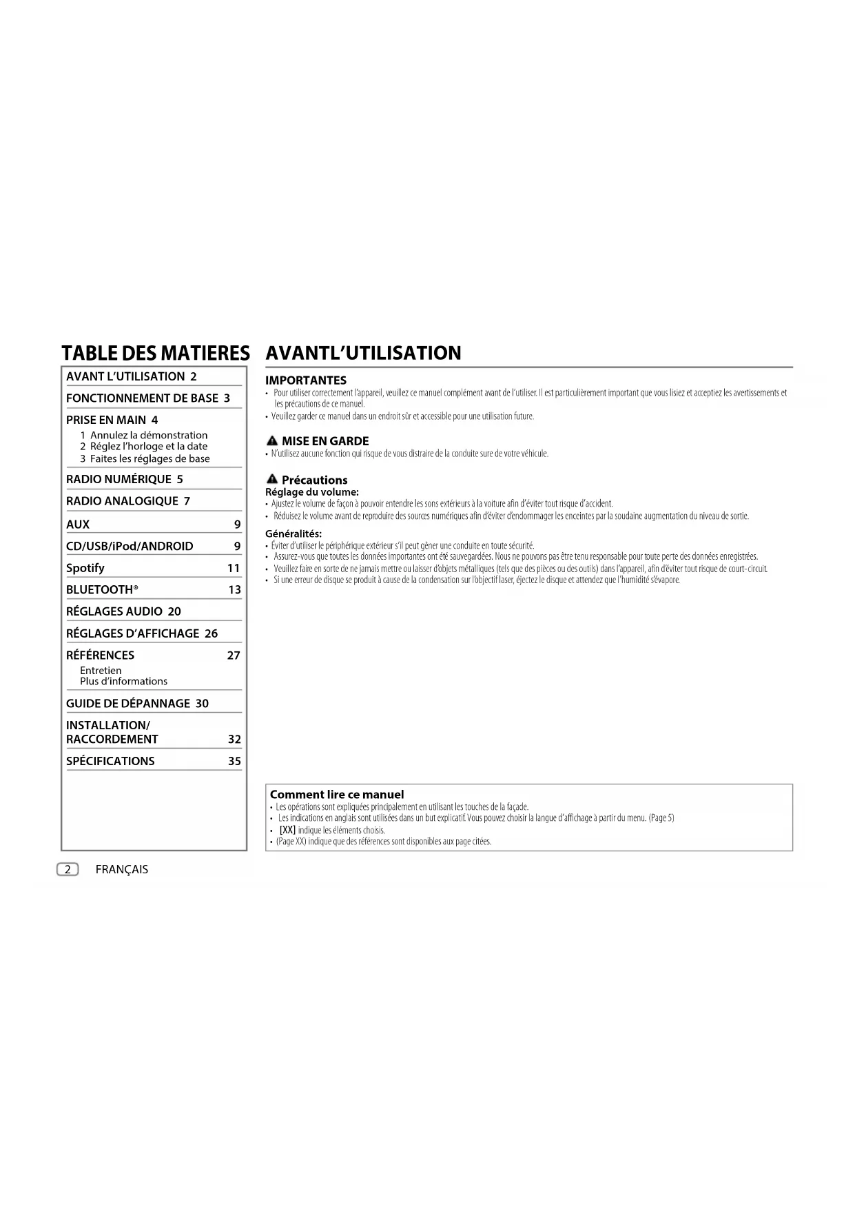 - Ajustez le volume de façon à pouvoir entendre les sons extérieurs à la voiture afin d’éviter tout risque d’accident.