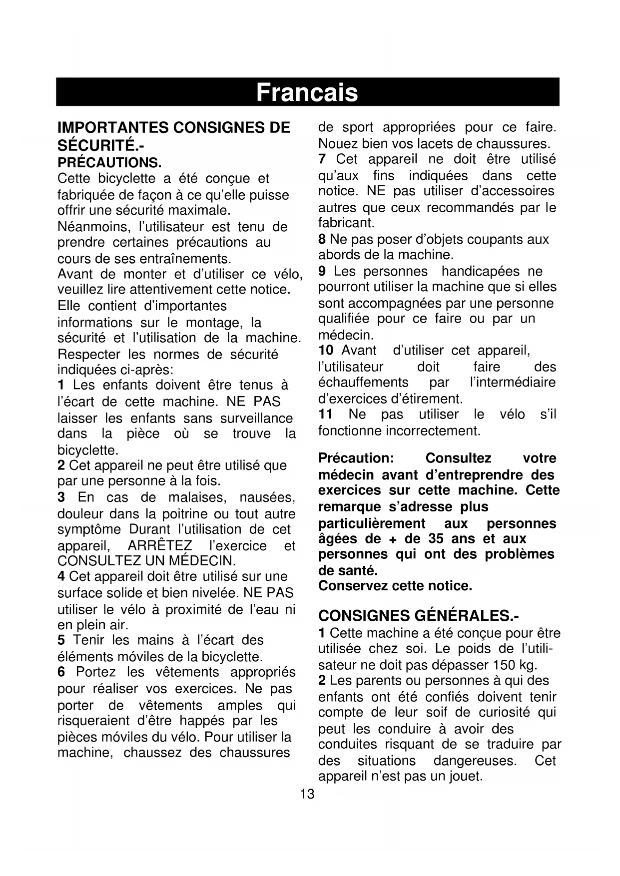 Précaution: Consultez votre médecin avant d'entreprendre des exercices sur cette machine. Cette remarque s'adresse plus particulièrement aux personnes âgées de + de 35 ans et aux personnes qui ont des problèmes de santé.