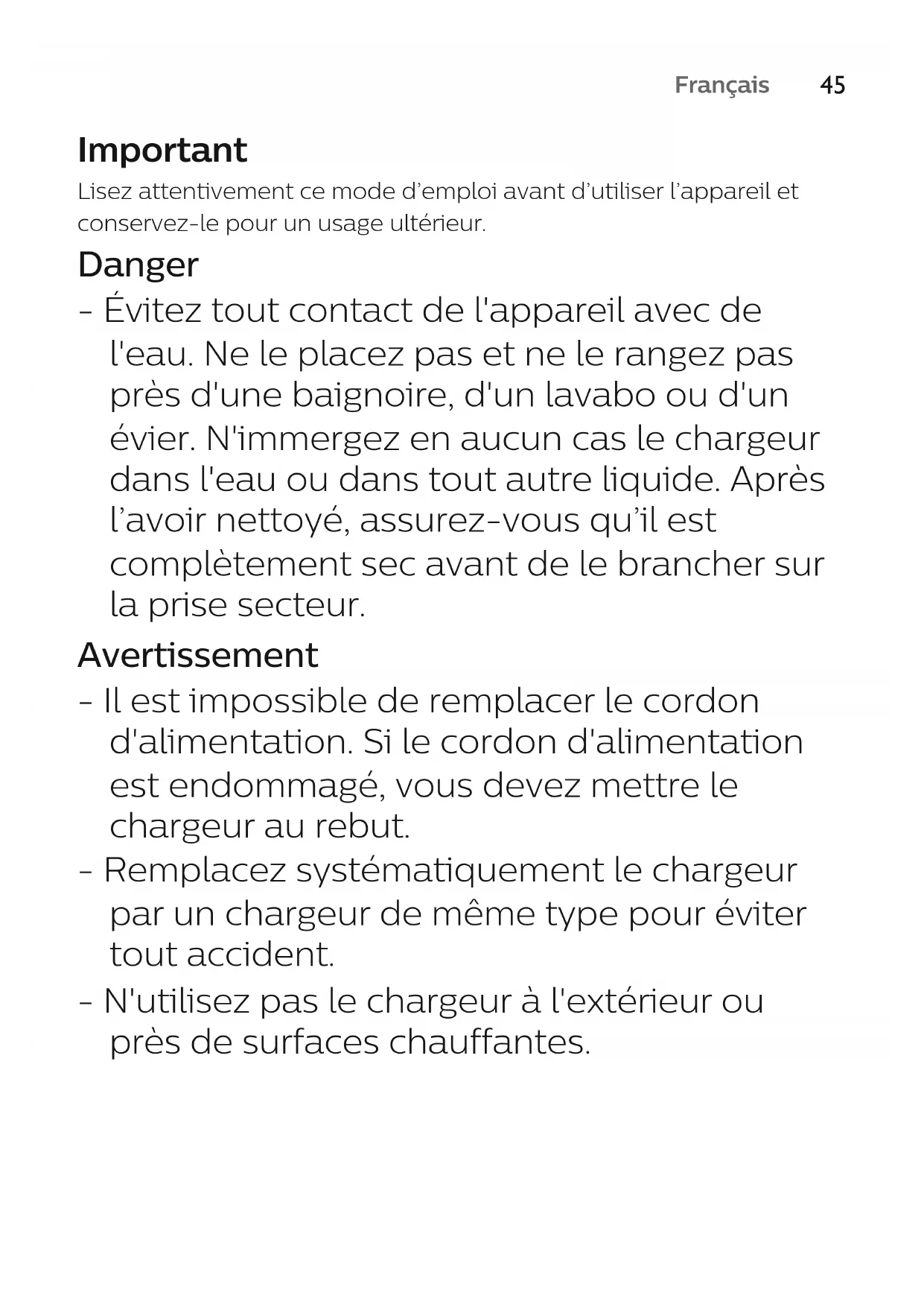 EspañolFrançais Important Lisez attentivement ce mode d’emploi avant d’utiliser l’appareil et conservez-le pour un usage ultérieur. Danger - Évitez tout contact de l'appareil avec de l'eau. Ne le placez pas et ne le rangez pas près d'une baignoire, d'un lavabo ou d'un évier. N'immergez en aucun cas le chargeur dans l'eau ou dans tout autre liquide. Après l’avoir nettoyé, assurez-vous qu’il est complètement sec avant de le brancher sur la prise secteur. Avertissement - Il est impossible de remplacer le cordon d'alimentation. Si le cordon d'alimentation est endommagé, vous devez mettre le chargeur au rebut. - Remplacez systématiquement le chargeur par un chargeur de même type pour éviter tout accident. - N'utilisez pas le chargeur à l'extérieur ou près de surfaces chauffantes.