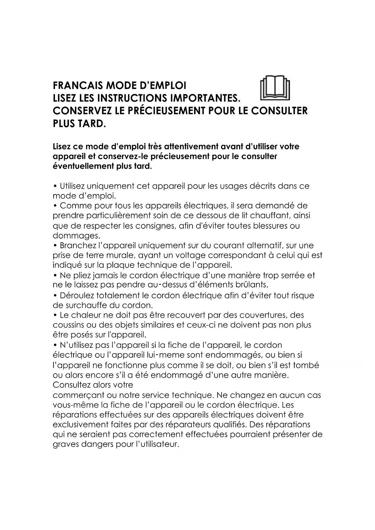 d'utiliser votre appareil et conservez-le précieusement pour le consulter éventuellement plus tard. En ce qui concerne la couverture chauffante, ne pas l'allumer alors qu'elle est pliée ou comprimée et ne pas l'enfouir dans le lit ou la poser à côté du matelas.