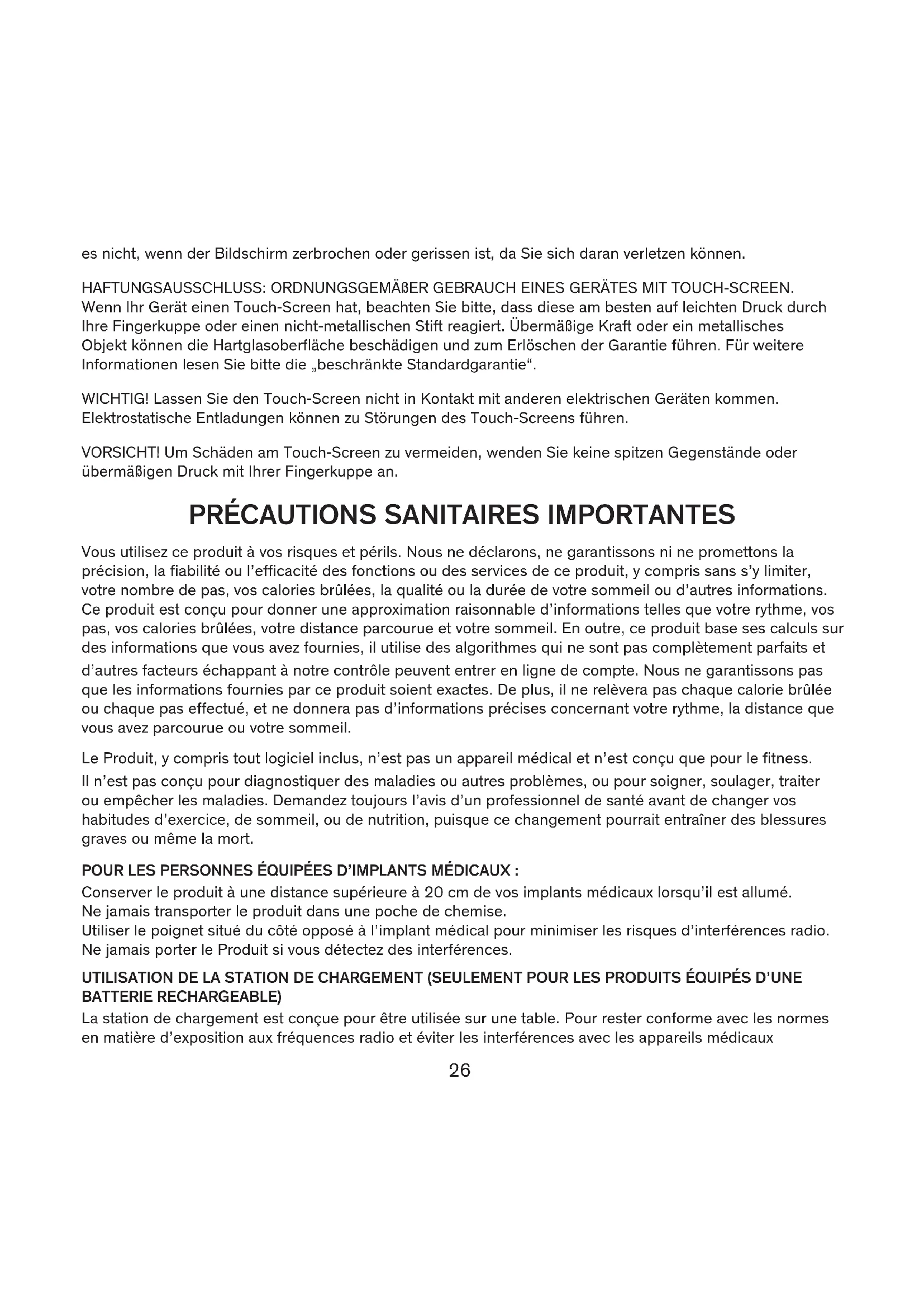Vous utilisez ce produit à vos risques et périls. Nous ne déclarons, ne garantissons ni ne promettons la précision, la fiabilité ou l’efficacité des fonctions ou des services de ce produit, y compris sans s’y limiter, votre nombre de pas, vos calories brûlées, la qualité ou la durée de votre sommeil ou d’autres informations. Ce produit est conçu pour donner une approximation raisonnable d’informations telles que votre rythme, vos pas, vos calories brûlées, votre distance parcourue et votre sommeil. En outre, ce produit base ses calculs sur des informations que vous avez fournies, il utilise des algorithmes qui ne sont pas complètement parfaits et d’autres facteurs échappant à notre contrôle peuvent entrer en ligne de compte. Nous ne garantissons pas que les informations fournies par ce produit soient exactes. De plus, il ne relèvera pas chaque calorie brûlée ou chaque pas effectué, et ne donnera pas d’informations précises concernant votre rythme, la distance que vous avez parcourue ou votre sommeil. Le Produit, y compris tout logiciel inclus, n’est pas un appareil médical et n’est conçu que pour le fitness. Il n’est pas conçu pour diagnostiquer des maladies ou autres problèmes, ou pour soigner, soulager, traiter ou empêcher les maladies. Demandez toujours l’avis d’un professionnel de santé avant de changer vos habitudes d’exercice, de sommeil, ou de nutrition, puisque ce changement pourrait entraîner des blessures graves ou même la mort. POUR LES PERSONNES ÉQUIPÉES D’IMPLANTS MÉDICAUX : Conserver le produit à une distance supérieure à 20 cm de vos implants médicaux lorsqu’il est allumé. Ne jamais transporter le produit dans une poche de chemise. Utiliser le poignet situé du côté opposé à l’implant médical pour minimiser les risques d’interférences radio. Ne jamais porter le Produit si vous détectez des interférences. UTILISATION DE LA STATION DE CHARGEMENT (SEULEMENT POUR LES PRODUITS ÉQUIPÉS D’UNE BATTERIE RECHARGEABLE) La station de chargement est conçue pour être utilisée sur une table. Pour rester conforme avec les normes en matière d’exposition aux fréquences radio et éviter les interférences avec les appareils médicaux27 implantés, ne vous approchez pas à moins de 15 cm de la station de chargement. PRÉCAUTIONS CONCERNANT LA BATTERIE INTÉGRÉE (SEULEMENT POUR LES PRODUITS ÉQUIPÉS D’UNE BATTERIE RECHARGEABLE) Ne jetez pas votre produit au feu. La batterie risquerait d’exploser. N’essayez pas de remplacer la batterie de votre produit. Elle est intégrée et n’est pas interchangeable. La batterie peut seulement être manipulée par des centres de réparation de FOSSIL. Chargez la batterie selon les instructions. Ne rechargez votre batterie qu’à l’aide des chargeurs approuvés par FOSSIL spécialement conçus pour votre produit. Ne tentez pas de forcer l’ouverture de la batterie intégrée. Votre produit utilise un chargeur homologué par la CEC. Les batteries (comme tous les équipements électroniques) ne doivent pas être recyclées ou jetées avec les autres déchets ménagers. ATTENTION ! L’utilisation d’une batterie ou d’un chargeur non approuvés par FOSSIL peut entraîner un risque d’explosion, de fuite ou d’autres dangers. La garantie de FOSSIL ne couvre pas les dégâts de l’appareil causés par des batteries et/ou des chargeurs non approuvés par FOSSIL. ATTENTION ! Certains produits sont équipés de batteries au lithium pouvant contenir du perchlorate – Certaines précautions d’utilisation pourraient être requises. Pour plus d’informations, rendez-vous sur www. dtsc.ca.gov/hazardouswaste/perchlorate PRENEZ CONNAISSANCE DES INSTRUCTIONS SUIVANTES CONCERNANT L’UTILISATION DES APPAREILS À ÉCRAN/ÉCRAN TACTILE DE FOSSIL. AVERTISSEMENT CONCERNANT L’ÉCRAN. L’écran de votre appareil est constitué de verre ou d’acrylique et peut se casser en cas de chute ou en cas d’impact important. N’utilisez pas l’appareil si l’écran est cassé ou fendu car vous pourriez vous blesser. EXCLUSION DE GARANTIE : UTILISATION APPROPRIÉE D’UN APPAREIL À ÉCRAN TACTILE. Si votre appareil dispose d’un affichage à écran tactile, n’oubliez pas qu’un écran tactile réagit mieux si vous l’effleurez du doigt ou si vous utilisez un stylet non métallique. Si vous appuyez trop fort ou utilisez un objet métallique pour faire fonctionner l’écran tactile, vous risquez d’endommager la surface en verre trempé et donc d’annuler la garantie. Pour plus d’informations, reportez-vous à la section « Garantie Limitée Standard ». POINT IMPORTANT ! Empêchez l’écran tactile d’entrer en contact avec d’autres appareils électriques. L’électricité statique peut causer un dysfonctionnement de l’écran tactile. ATTENTION ! Pour éviter d’endommager l’écran tactile, ne vous servez pas d’un objet pointu et n’exercez pas une pression du doigt excessive lorsque vous utilisez votre appareil.