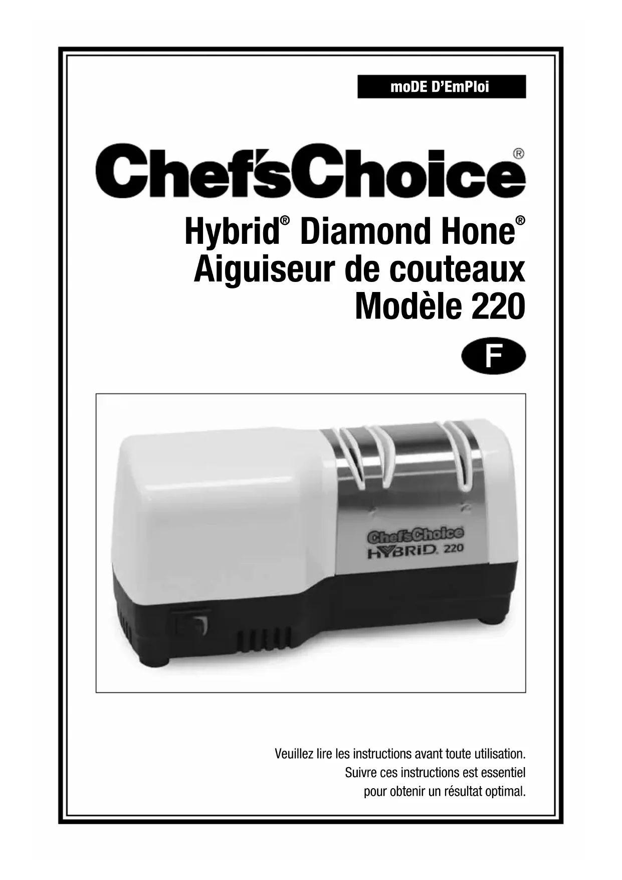 Vous serez ravi par la facilité d'utilisation de l'aiguiseur Chef'sChoice® Hybrid Diamond Hone® 220 et par l'efficacité de vos couteaux. Veuillez lire et suivre les instructions attentivement. Gardez l'aiguiseur à portée de main pour pouvoir apprécier au quotidien le plaisir de couteaux bien aiguisés.