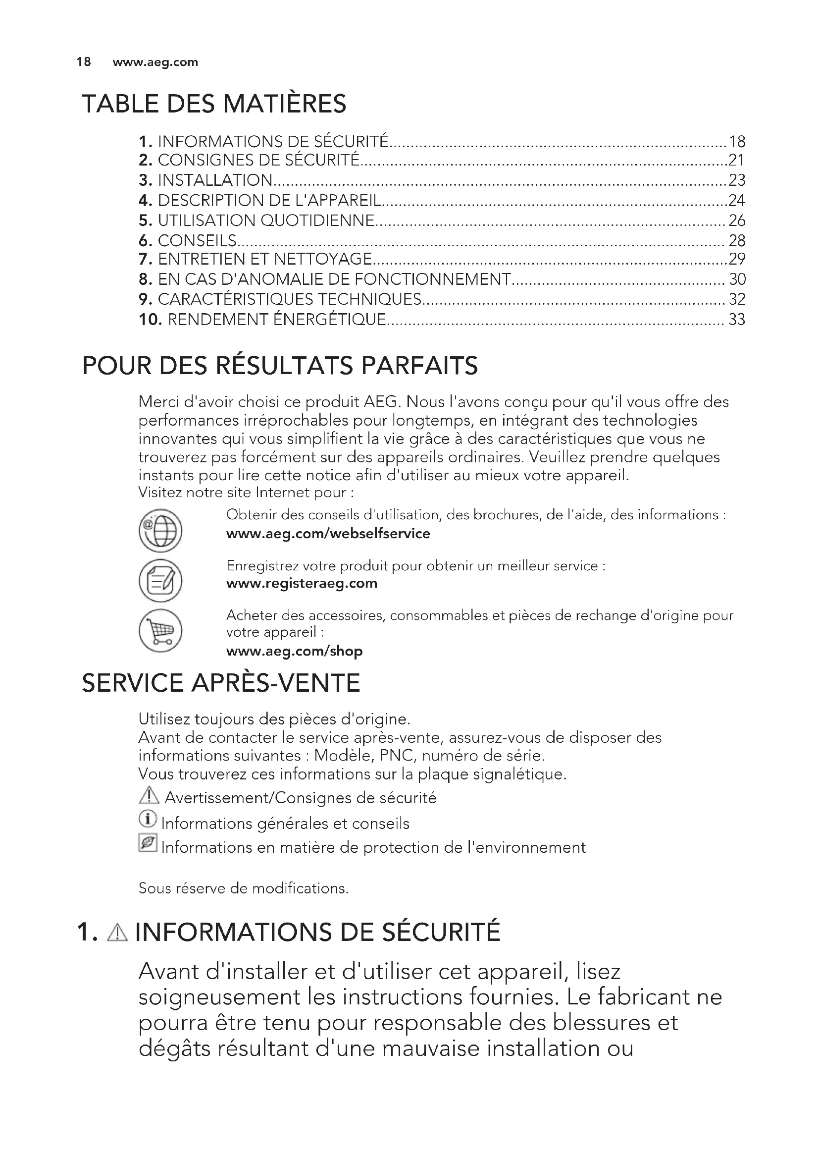 Avant d'installer et d'utiliser cet appareil, lisez soigneusement les instructions fournies. Le fabricant ne pourra être tenu pour responsable des blessures et dégâts résultant d'une mauvaise installation ou www.aeg.com 18utilisation. Conservez toujours les instructions dans un lieu sûr et accessible pour vous y référer ultérieurement.