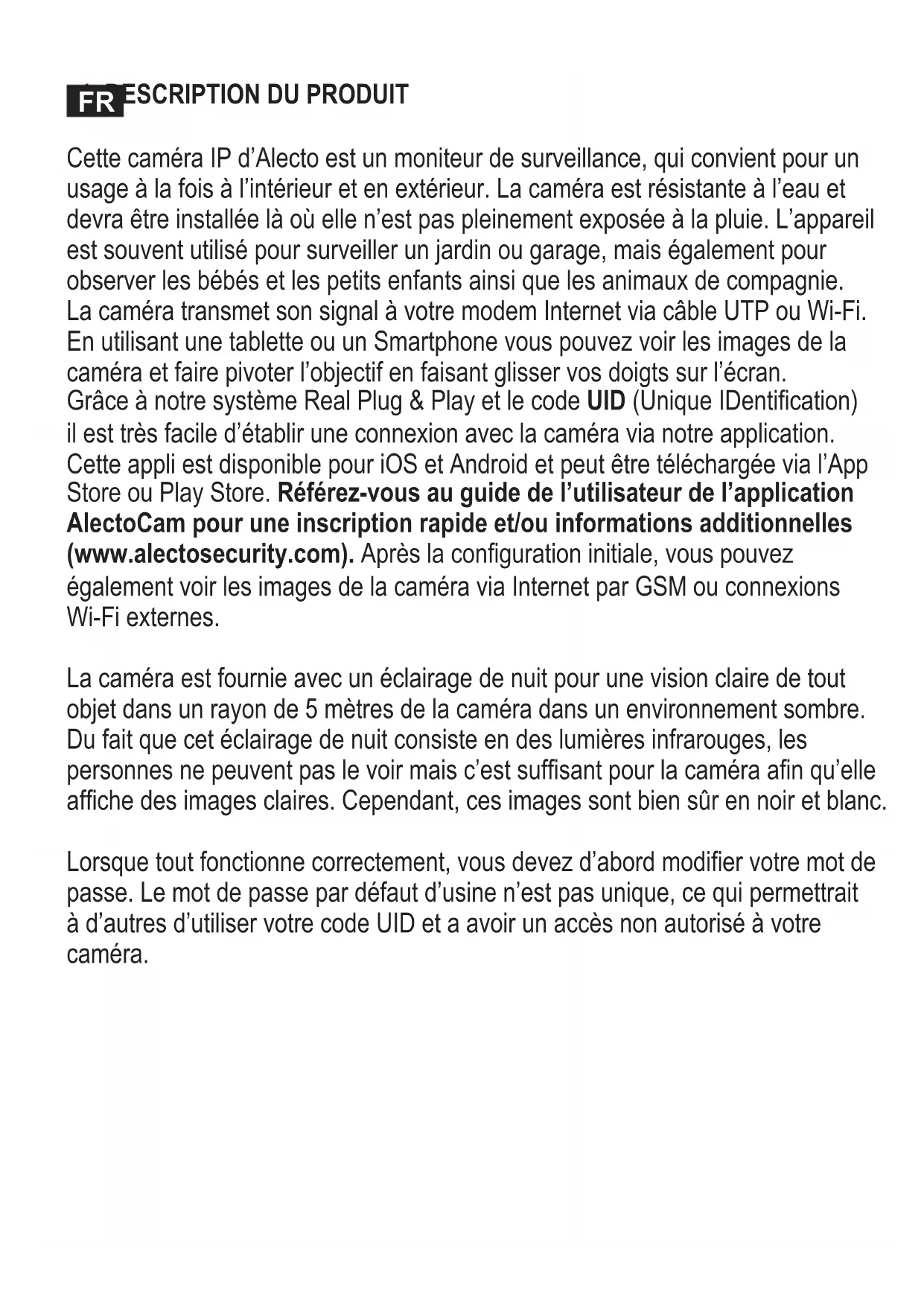 De Alecto Camera voldoet aan de essentiële voorwaarden en voorzieningen zoals omschreven in de Europese richtlijn 2014/53/EU. De verklaring van conformiteit is beschikbaar op de website http://DOC.hesdo.com/DVC-135IP-DOC.pdf Frequentie : 2407 – 2475 MHz Maximum Vermogen : < 20 dBm7. SPECIFICATIONS CAMERA Image Sensor 1/4” Color CMOS sensor Display Resolution 1280 x 720 Pixels (1000K Pixels, i.e. 1.0 Megapixel) Lens 3.6mm Mini. Illumination 0.5 Lux Viewing Angle 90 Degree Audio Not supported Input Not supported Output Not supported Image Compression H.264, MJPEG Image Frame Rate 30fps (VGA), 30fps (QVGA) Resolution 1280x720 (VGA), 640x480 (VGA), 320x240 (QVGA) Flip Mirror Images Vertical / Horizontal Light Freqeuncy 50Hz, 60Hz, Outdoor Ethernet interface Build in 10/100Mbps, Auto MDI/MDIX, RJ-45 Supported Protocol TCP/IP, HTTP DNS DHCP PPPoE SMTP FTP SSL TFTP NTP ARP/RARP NFS RTSP RTP RTCP Compress rate level 128Kbps~4Mbps Wireless Standard IEEE 802.11b/g/n Frequentie range 2412-2472 MHz Transmitted power 19.27 dBm EIRP Date Rate 802.11b: 11Mbps (max), 80211g: 54Mbps (max.), 802.11n: 150Mbps (max.) Wireless Securtiy WEP & WPA WPA2 Encryption Pan/tilt Angle Not supported Infrared Light 24 IR LEDs, Night visibility up to 5 meters Alarm Input / Output Not supported TF/SD card Internal 8GB Power Supply DC 5 V/2.0A (adapter) Power Consumption 7 Watts (Max.) Operate Temper. 0˚ ~ 55˚C (14˚F ~ 131˚F) Operating Humidity 20% ~ 85% non-condensing Storage Temper. -10˚C ~ 60˚ (14˚F ~ 140˚F) Operating Humidity 0% ~ 90% non-condensing Certication CE, FCC, RoHS8 GARANTIE Op deze IP camera heeft u een garantie van 24 maanden na aankoopdatum. Wij garanderen gedurende die periode de kosteloze herstelling van defecten ontstaan door materiaal- en constructiefouten. Een en ander ter uiteindelijke beoordeling van de importeur. HOE TE HANDELEN: Bemerkt u een defect, raadpleeg dan eerst deze gebruiksaanwijzing. Geeft deze hieromtrent geen uitsluitsel, bekijk dan de laatste versie van deze gebruiksaanwijzing via internet. (www.alecto.nl) of raadpleeg de leverancier van deze camera of de serviceafdeling van Alecto: www.alecto.nl DE GARANTIE VERVALT: Bij ondeskundig gebruik, foutieve aansluiting, foutieve installatie van firmware, gebruik van niet originele onderdelen of toebehoren, verwaarlozing en bij defecten ontstaan door vocht, vuur, overstroming, blikseminslag en natuurrampen. Bij onbevoegde wijzigingen en/of reparaties door derden. Bij onjuist transport van het apparaat zonder geschikte verpakking en indien het apparaat niet vergezeld is van dit garantiebewijs en de aankoopbon. Aansluitsnoeren en stekkers vallen niet onder de garantie. Iedere verdere aansprakelijkheid, met name voor eventuele gevolgschade, is uitgesloten.1 DESCRIPTION DU PRODUIT Cette caméra IP d’Alecto est un moniteur de surveillance, qui convient pour un usage à la fois à l’intérieur et en extérieur. La caméra est résistante à l’eau et devra être installée là où elle n’est pas pleinement exposée à la pluie. L’appareil est souvent utilisé pour surveiller un jardin ou garage, mais également pour observer les bébés et les petits enfants ainsi que les animaux de compagnie. La caméra transmet son signal à votre modem Internet via câble UTP ou Wi-Fi. En utilisant une tablette ou un Smartphone vous pouvez voir les images de la caméra et faire pivoter l’objectif en faisant glisser vos doigts sur l’écran. Grâce à notre système Real Plug & Play et le code UID (Unique IDentication) il est très facile d’établir une connexion avec la caméra via notre application. Cette appli est disponible pour iOS et Android et peut être téléchargée via l’App Store ou Play Store. Référez-vous au guide de l’utilisateur de l’application AlectoCam pour une inscription rapide et/ou informations additionnelles (www.alectosecurity.com). Après la conguration initiale, vous pouvez également voir les images de la caméra via Internet par GSM ou connexions Wi-Fi externes. La caméra est fournie avec un éclairage de nuit pour une vision claire de tout objet dans un rayon de 5 mètres de la caméra dans un environnement sombre. Du fait que cet éclairage de nuit consiste en des lumières infrarouges, les personnes ne peuvent pas le voir mais c’est sufsant pour la caméra an qu’elle afche des images claires. Cependant, ces images sont bien sûr en noir et blanc. Lorsque tout fonctionne correctement, vous devez d’abord modier votre mot de passe. Le mot de passe par défaut d’usine n’est pas unique, ce qui permettrait à d’autres d’utiliser votre code UID et a avoir un accès non autorisé à votre caméra. FR2 INSCRIPTION