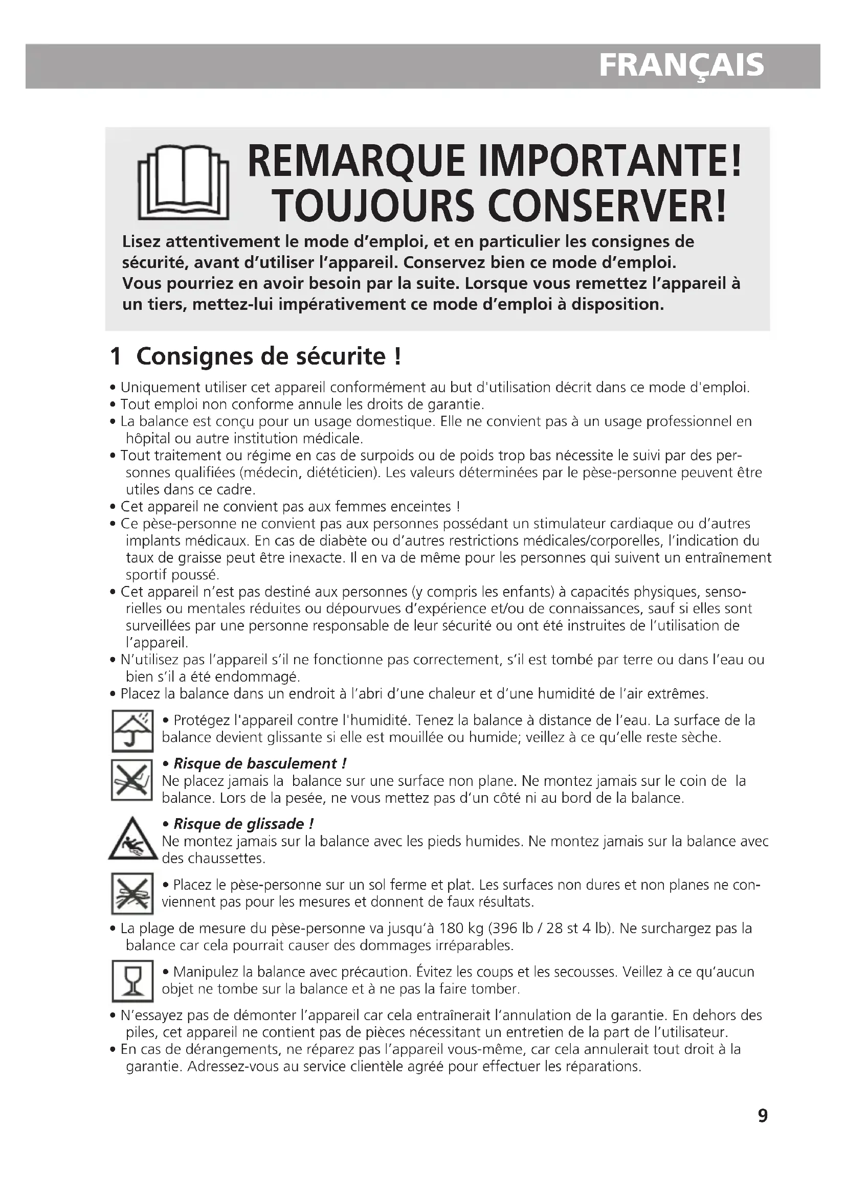 - La balance est conçu pour un usage domestique. Elle ne convient pas à un usage professionnel en hôpital ou autre institution médicale.