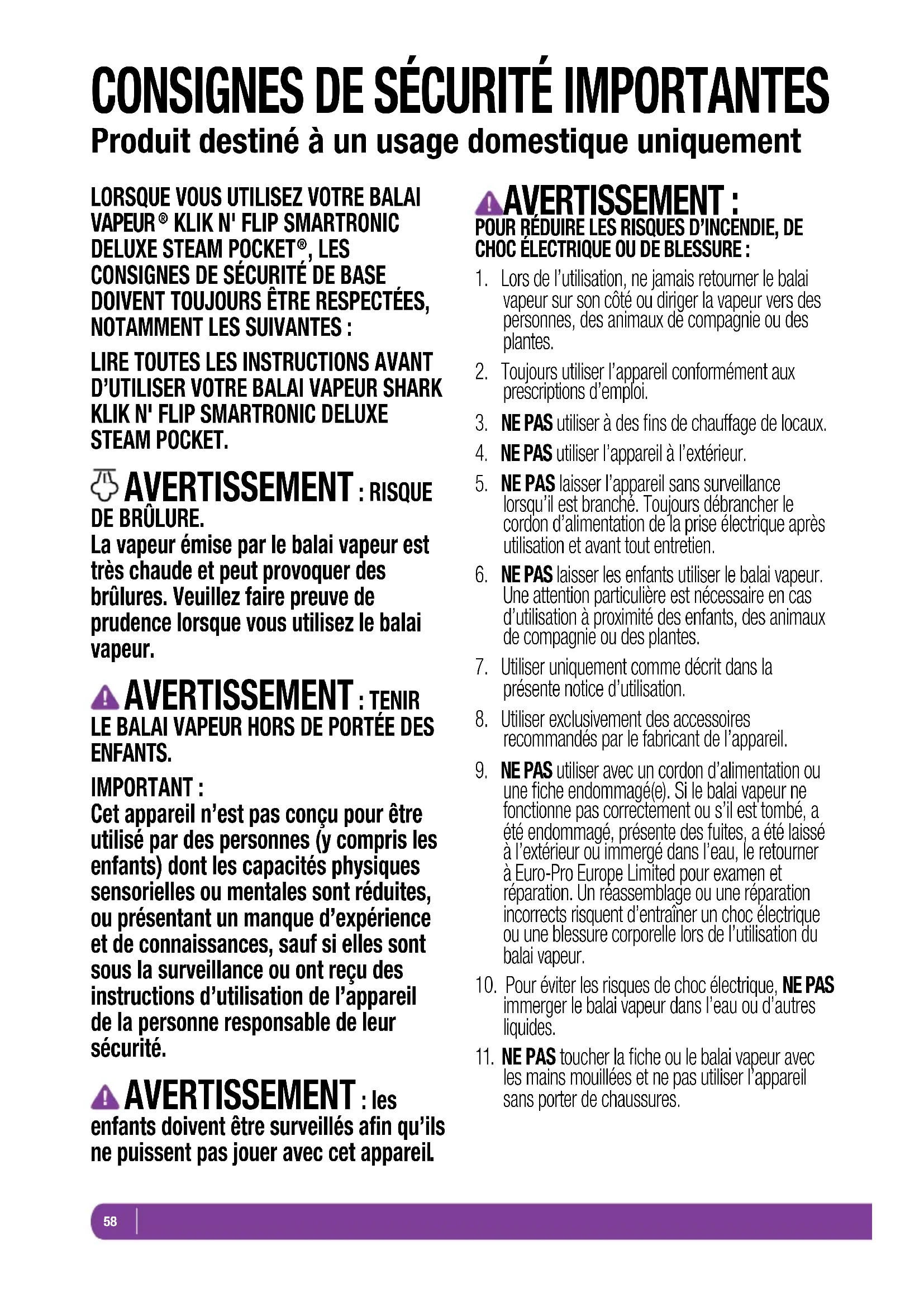6. NE PAS laisser les enfants utiliser le balai vapeur.