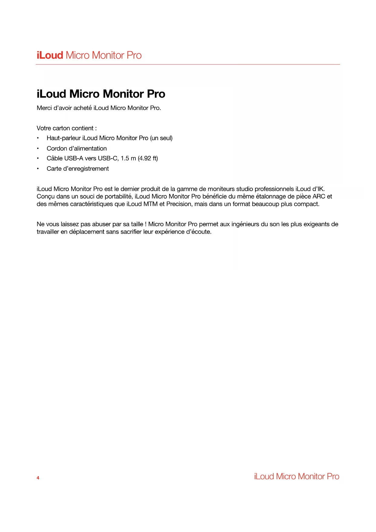 - Poids : 1,37 kg (3,02 lb.)iLoud Micro Monitor Pro Support Support Pour toute question, veuillez consulter la page web FAQ à l’adresse suivante : ikmultimedia.com/faq Vous trouverez ici les réponses aux questions les plus fréquemment posées. Pour soumettre un formulaire d’assistance technique, rendez-vous à l’adresse suivante : ikmultimedia.com/support Pour obtenir des informations sur la garantie, veuillez consulter le site : ikmultimedia.com/warranty Pour d’autres demandes telles que des informations sur les produits, les ventes ou le site web, veuillez vous rendre à l’adresse suivante : ikmultimedia.com/contact-us IK Product Manager Le IK Product Manager vous offre un emplacement central pour gérer tous les derniers produits IK Multimedia. C’est votre emplacement central pour l’enregistrement, les téléchargements, l’installation, l’autorisation, la vérification des mises à jour, et bien plus encore.