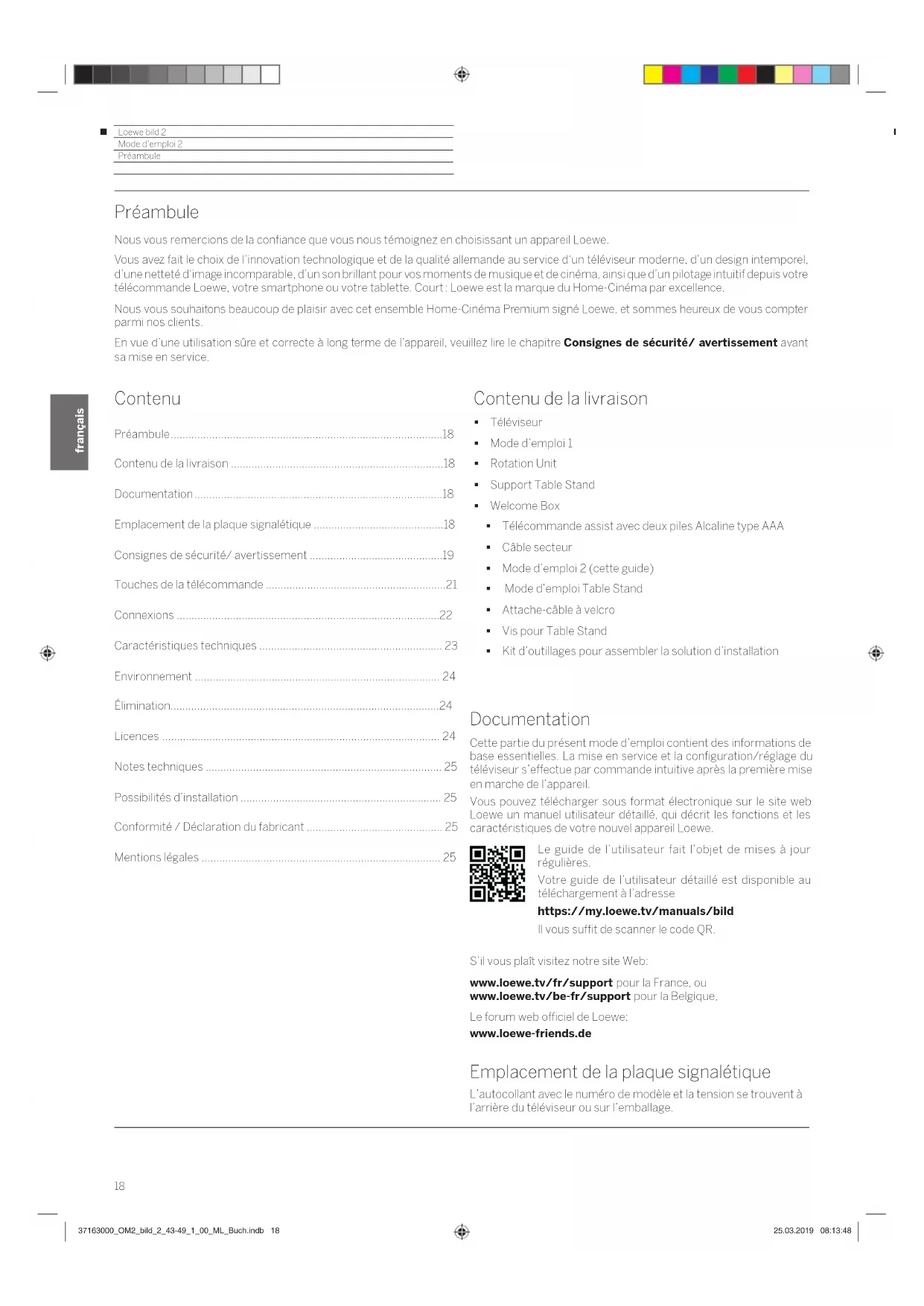 - Mentions légales Contenu de la livraison Téléviseur Mode d’emploi 1 Rotation Unit Support Table Stand Welcome Box Télécommande assist avec deux piles Alcaline type AAA Câble secteur Mode d’emploi 2 (cette guide) Mode d’emploi Table Stand Attache-câble à velcro Vis pour Table Stand Kit d’outillages pour assembler la solution d’installation Documentation Cette partie du présent mode d’emploi contient des informations de base essentielles. La mise en service et la configuration/réglage du téléviseur s’effectue par commande intuitive après la première mise en marche de l’appareil. Vous pouvez télécharger sous format électronique sur le site web Loewe un manuel utilisateur détaillé, qui décrit les fonctions et les caractéristiques de votre nouvel appareil Loewe. Le guide de l’utilisateur fait l’objet de mises à jour régulières. Votre guide de l’utilisateur détaillé est disponible au téléchargement à l’adresse https://my.loewe.tv/manuals/bild Il vous suffit de scanner le code QR. S’il vous plaît visitez notre site Web: www.loewe.tv/fr/support pour la France, ou www.loewe.tv/be-fr/support pour la Belgique, Le forum web officiel de Loewe: www.loewe-friends.de Emplacement de la plaque signalétique L’autocollant avec le numéro de modèle et la tension se trouvent à l’arrière du téléviseur ou sur l’emballage. p. 25