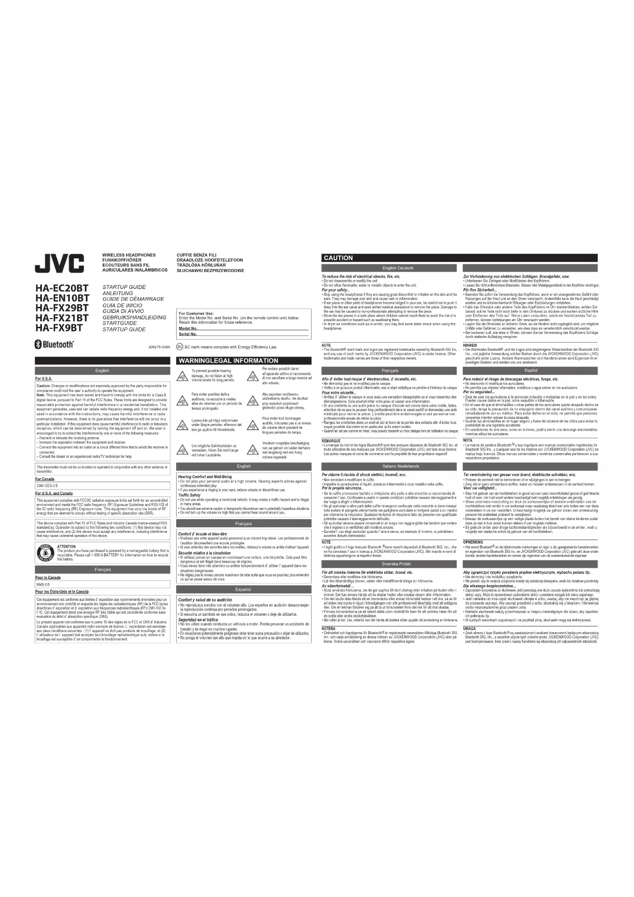 - Arrêtez d’ utiliser le casque si vous avez une sensation désagréable ou si vous ressentez des démangeaisons. Cela pourrait irriter votre peau et causer une inflammation.• Si une oreillette ou une autre pièce du casque d'écoute est coincé dans votre oreille, faites attention de ne pas la pousser trop profondément dans le canal auditif et demandez une aide médicale pour retirer la pièce. L'oreille peut être endommagée si une personne non professionnelle essaie de retirer la pièce.• Rangez les oreillettes dans un endroit sûr et hors de la portée des enfants afin d'éviter tout risque possible d'accident et en particulier qu'ils soient avalés. Quand l’air est sec comme en hiver, vous pouvez ressentir un choc statique lors de l’utilisation du casque.REMARQUE La marque du mot et les logos Bluetooth sont des marques déposées de Bluetooth SIG Inc. et toute utilisation de ces marques par JVCKENWOOD Corporation (JVC) est faite sous licence. Les autres marques et noms de commerce sont la propriété de leur propriétaire respectif. Para reducir el riesgo de descargas eléctricas, fuego, etc.