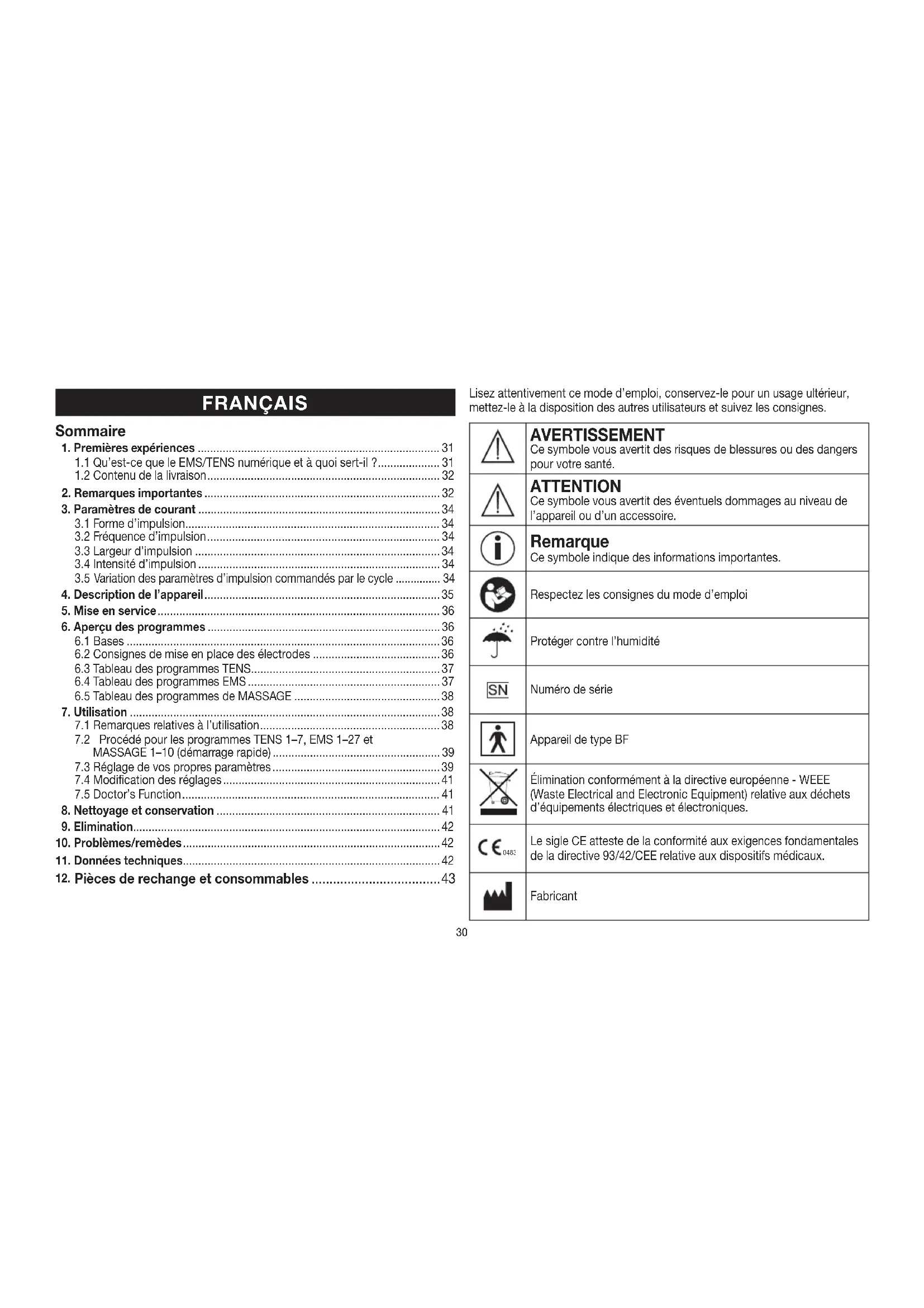 Appareil EMS/TENS numérique Mode d’emploi ............................................ 30