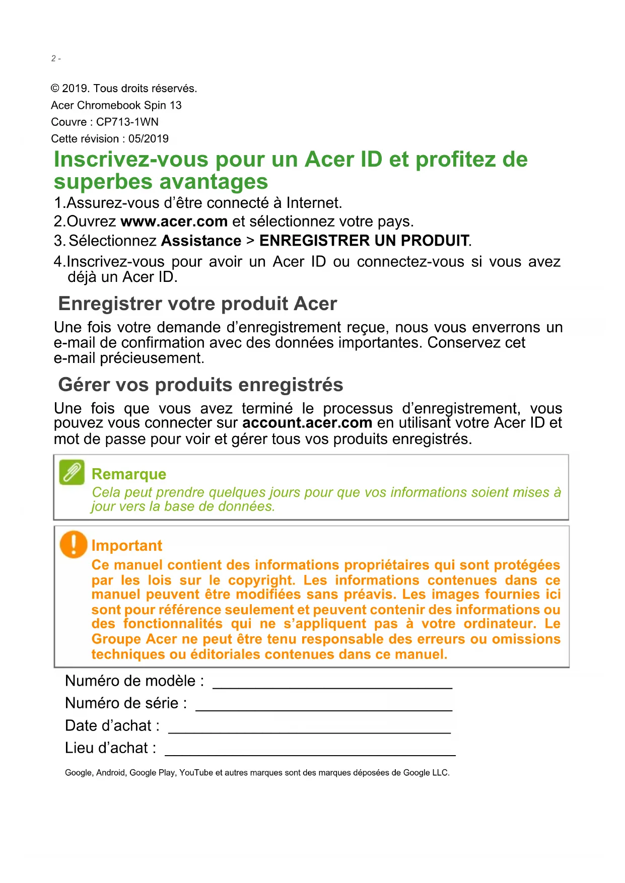 © 2019. Tous droits réservés. Acer Chromebook Spin 13 Couvre : CP713-1WN Cette révision : 05/2019 Inscrivez-vous pour un Acer ID et profitez de superbes avantages 1.Assurez-vous d’être connecté à Internet. 2.Ouvrez www.acer.com et sélectionnez votre pays. 3.Sélectionnez Assistance > ENREGISTRER UN PRODUIT. 4.Inscrivez-vous pour avoir un Acer ID ou connectez-vous si vous avez déjà un Acer ID. Enregistrer votre produit Acer Une fois votre demande d’enregistrement reçue, nous vous enverrons un e-mail de confirmation avec des données importantes. Conservez cet e-mail précieusement. Gérer vos produits enregistrés Une fois que vous avez terminé le processus d’enregistrement, vous pouvez vous connecter sur account.acer.com en utilisant votre Acer ID et mot de passe pour voir et gérer tous vos produits enregistrés. Remarque Cela peut prendre quelques jours pour que vos informations soient mises à jour vers la base de données. Numéro de modèle : ____________________________ Numéro de série : ______________________________ Date d’achat : _________________________________ Lieu d’achat : __________________________________ Google, Android, Google Play, YouTube et autres marques sont des marques déposées de Google LLC. Important Ce manuel contient des informations propriétaires qui sont protégées par les lois sur le copyright. Les informations contenues dans ce manuel peuvent être modifiées sans préavis. Les images fournies ici sont pour référence seulement et peuvent contenir des informations ou des fonctionnalités qui ne s’appliquent pas à votre ordinateur. Le Groupe Acer ne peut être tenu responsable des erreurs ou omissions techniques ou éditoriales contenues dans ce manuel.Table des matières - 3